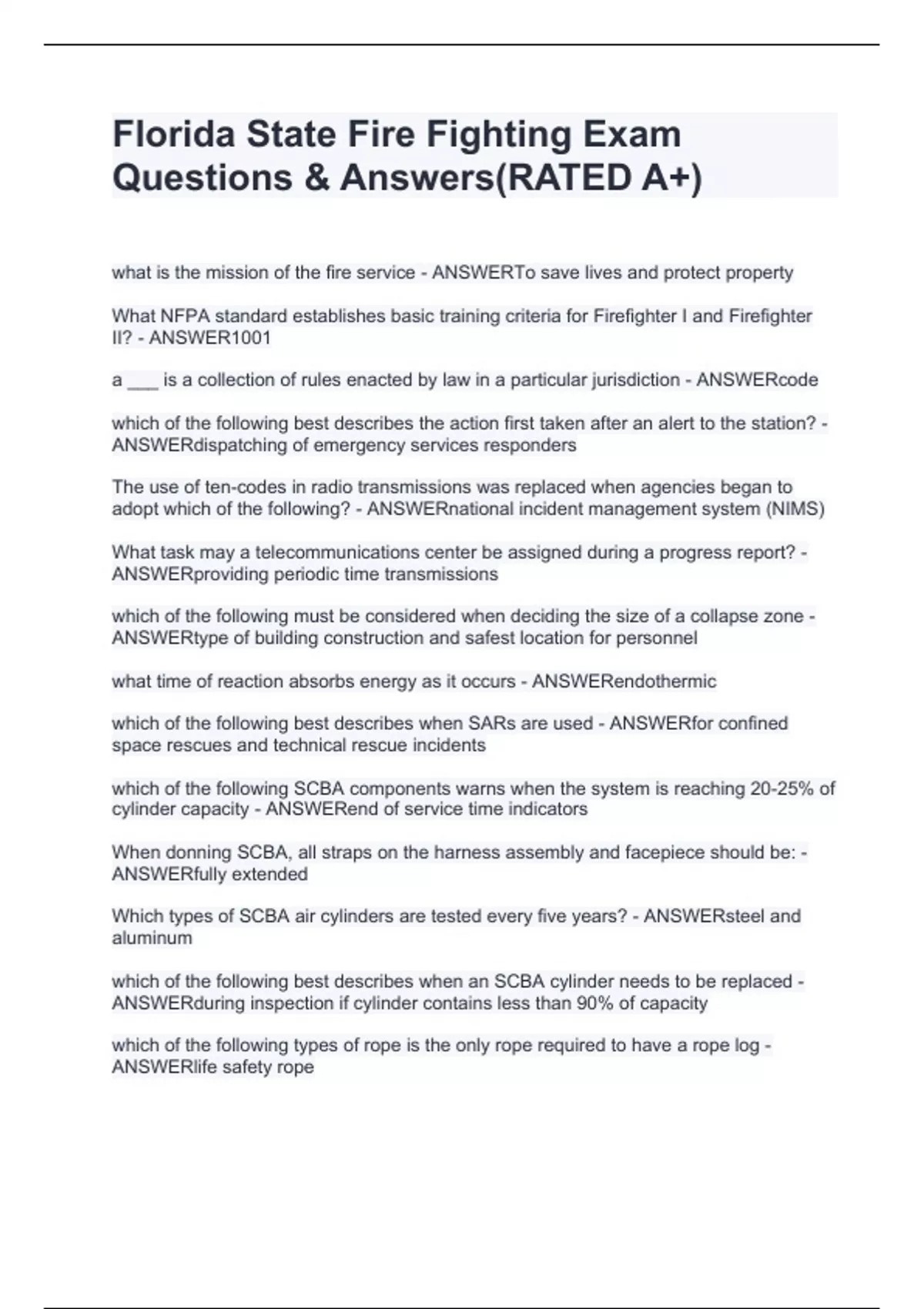 Florida State Fire Fighting Exam Questions & Answers(RATED A+)