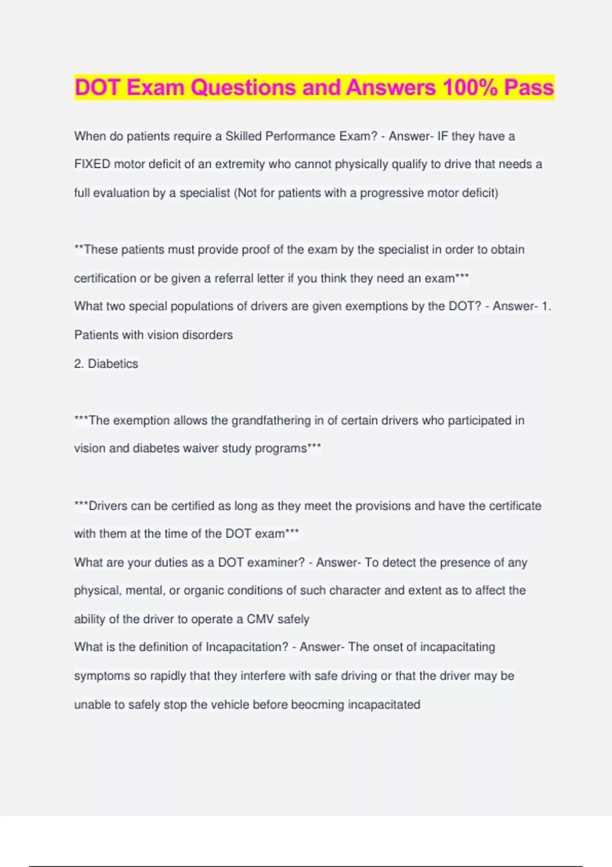 DOT Exam Questions and Answers 100% Pass When do patients require a Skilled Performance Exam? - Answer- IF they have a FIXED motor deficit of an extremity who cannot physically qualify to drive that needs a full evaluation by a specialist (Not for patients with a progressive motor deficit) **These patients must provide proof of the exam by the specialist in order to obtain certification or be given a referral letter if you think they need an exam*** What two special populations of drivers are given exemptions by the DOT? - Answer- 1. Patients with vision disorders 2. Diabetics ***The exemption allows the grandfathering in of certain drivers who participated in vision and diabetes waiver study programs*** ***Drivers can be certified as long as they meet the provisions and have the certificate with them at the time of the DOT exam*** What are your duties as a DOT examiner? - Answer- To detect the presence of any physical, mental, or organic conditions of such character and extent as to affect the ability of the driver to operate a CMV safely What is the definition of Incapacitation? - Answer- The onset of incapacitating symptoms so rapidly that they interfere with safe driving or that the driver may be unable to safely stop the vehicle before beocming incapacitated If the patient has any side effects of medications, can they be certified? - Answer- NO!! Any side effects such as drowsiness, dizziness, orthostasis, blurred vision or changes in mental status prohibit the driver from being certified What conditions lead to AUTOMATIC DISQUALIFICATION for DOT certificates? - Answer- DEFIBRILLATOR DIALYSIS What are the VISION requirements for DOT certification? - Answer- 1. Distant visual acuity of at least 20/40 in EACH EYE with or w/o lenses 2. Distant BINOCULAR vision of at least 20/40 in both eyes, with or w/o lenses 3. Field of vision of AT LEAST 70 DEGREES in the horizontal meridian in each eye 4. Ability to recognize/distinguish among colors of traffic signals (RED, AMBER, GREEN) Can a driver with monocular vision obtain a DOT certificate? - Answer- YES, but the driver must be otherwise medically fit for duty and granted a FEDERAL VISION EXEMPTION CERTIFICATE **Pt must return with the certificate of exemption before the DOT certificate can be given*** If a driver comes for a physical and is otherwise fit, you can disqualify them and the driver can apply for a federal vision exemption What is MONOCULAR VISION? - Answer- Monocular vision occurs when the vision requirements are only met in one eye, with or without corrective lenses ***MONOCULAR VISION IS AUTOMATICALLY DISQUALIFYING*** How do you certify a driver who is in the process of applying for a Federal vision exemption? - Answer- YOu can certify the driver for up to 1 year, mark the accompanied by EXEMPTION checkbox and write vision so that the type of federal exemption is specified What are the hearing requirements to obtain a DOT certificate? - Answer- 1. Driver must first perceive a whispered voice in one ear @ no less than 5 feet (only required in 1 ear
