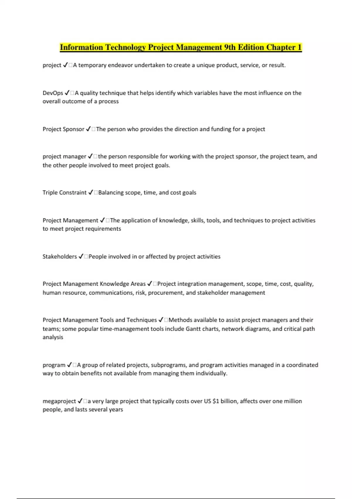 Information Technology Project Management 9th Edition Chapter 1 project ️A temporary endeavor undertaken to create a unique product, service, or result. DevOps ️A quality technique that helps identify which variables have the most influence on the overall outcome of a process Project Sponsor ️The person who provides the direction and funding for a project project manager ️the person responsible for working with the project sponsor, the project team, and the other people involved to meet project goals. Triple Constraint ️Balancing scope, time, and cost goals Project Management ️The application of knowledge, skills, tools, and techniques to project activities to meet project requirements Stakeholders ️People involved in or affected by project activities Project Management Knowledge Areas ️Project integration management, scope, time, cost, quality, human resource, communications, risk, procurement, and stakeholder management Project Management Tools and Techniques ️Methods available to assist project managers and their teams; some popular time-management tools include Gantt charts, network diagrams, and critical path analysis program ️A group of related projects, subprograms, and program activities managed in a coordinated way to obtain benefits not available from managing them individually. megaproject ️a very large project that typically costs over US $1 billion, affects over one million people, and lasts several years Program Manager ️A person who provides leadership and direction for the project managers heading the projects within a program Project portfolio management ️When organizations group and manage projects as a portfolio of investments that contribute to the entire enterprise's success portfolio ️Projects, programs, subsidiary portfolios, and operations managed as a group to achieve strategic objectives. best practice ️An optimal way recognized by industry to achieve a stated goal or objective organizational project management ️A framework in which portfolio, program, and project management are integrated with organizational enablers in order to achieve strategic objectives. leader ️A person who focuses on long-term goals and big-picture objectives, while inspiring people to reach those goals manager ️A person who deals with the day-to-day details of meeting specific goals Laissez-faire ️a leadership style meaning "let go," this hands-off approach lets teams determine their own goals and how to achieve them Transactional ️a leadership style using a management by exception approach that focuses on acheiving goals or compliance by offering team members appropriate rewards and punishments servant leader ️a leadership style in which people focus on relationships and community first and