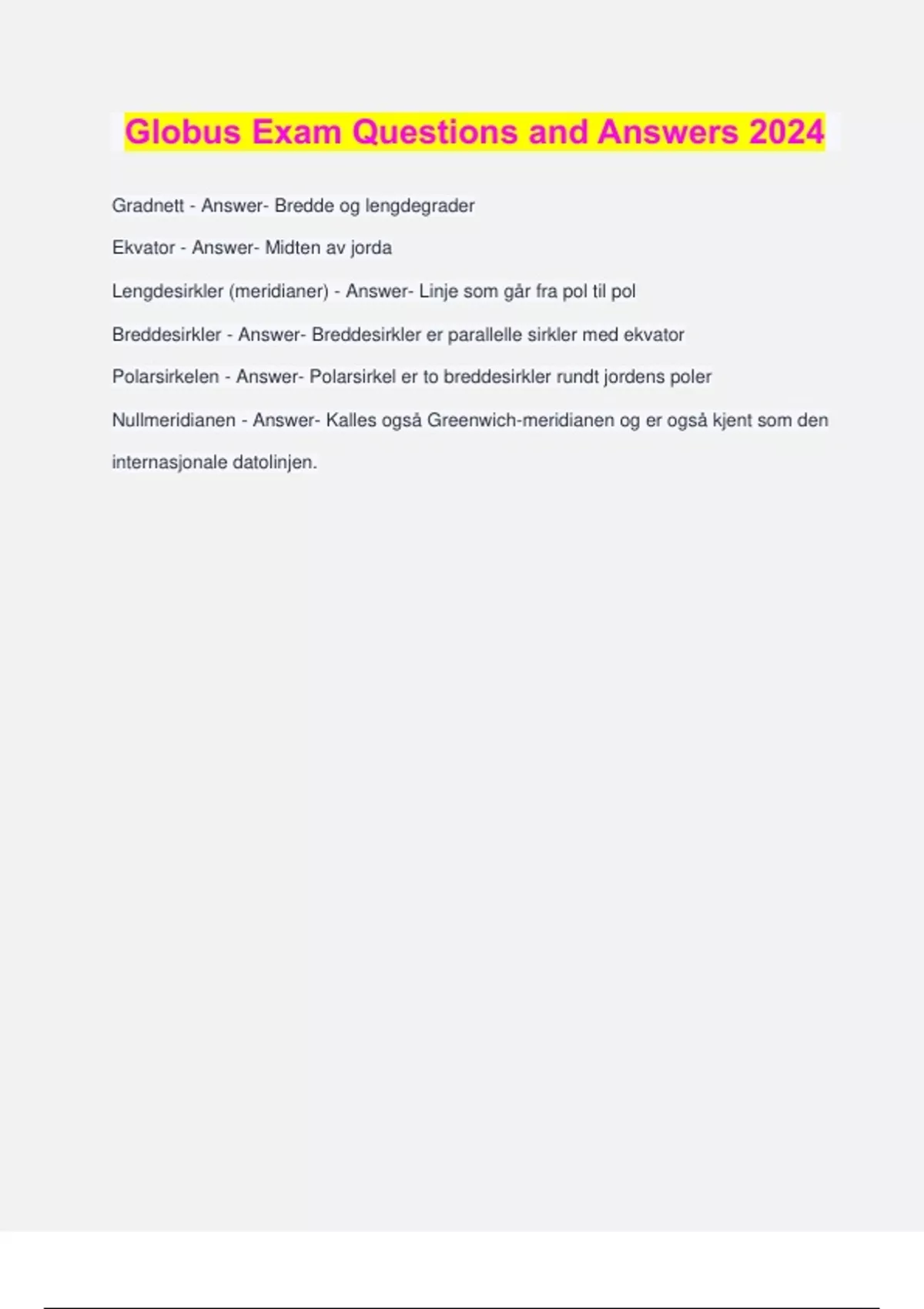 Globus Exam Questions and Answers 2024 Gradnett - Answer- Bredde og lengdegrader Ekvator - Answer- Midten av jorda Lengdesirkler (meridianer) - Answer- Linje som går fra pol til pol