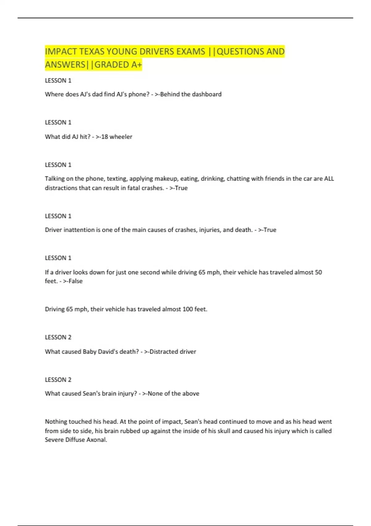 IMPACT TEXAS YOUNG DRIVERS EXAMS ||QUESTIONS AND ANSWERS||GRADED A+ LESSON 1 Where does AJ's dad find AJ's phone? - >-Behind the dashboard LESSON 1 What did AJ hit? - >-18 wheeler LESSON 1 Talking on the phone, texting, applying makeup, eating, drinking, chatting with friends in the car are ALL distractions that can result in fatal crashes. - >-True LESSON 1 Driver inattention is one of the main causes of crashes, injuries, and death. - >-True LESSON 1 If a driver looks down for just one second while driving 65 mph, their vehicle has traveled almost 50 feet. - >-False Driving 65 mph, their vehicle has traveled almost 100 feet. LESSON 2 What caused Baby David's death? - >-Distracted driver LESSON 2 What caused Sean's brain injury? - >-None of the above Nothing touched his head. At the point of impact, Sean's head continued to move and as his head went from side to side, his brain rubbed up against the inside of his skull and caused his injury which is called Severe Diffuse Axonal. LESSON 2 The National Safety Council reports that distracted driving leads to 16 thousand crashes each year. - >- False 1.6 million crashes each year LESSON 2 Drivers who text spend about 10% of their driving time outside their own driving lane. - >-True LESSON 2 Someone texting or talking spans an average of 27 seconds after they put the phone down are still thinking about what they just did is called latency. - >-True LESSON 3 Most skilled individuals texting are less likely to have an accident com