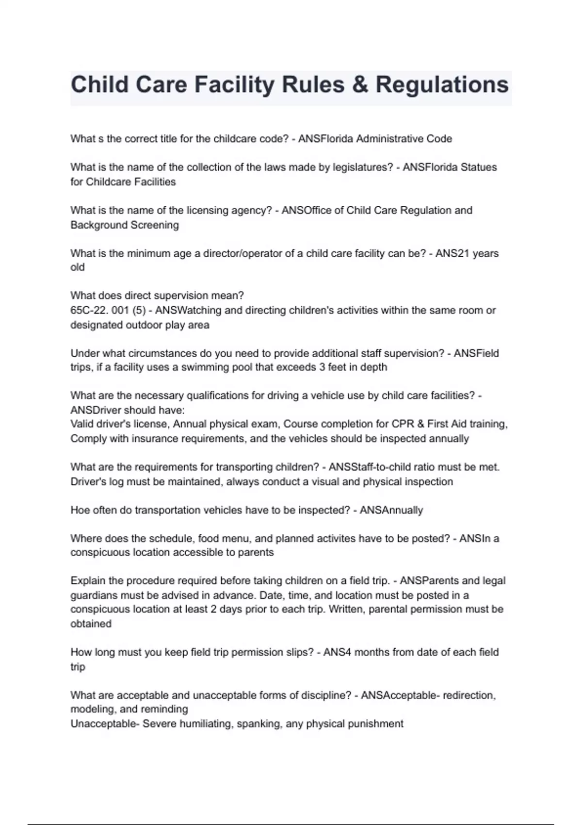Child Care Facility Rules & Regulations 2024/2025 (100% verified) A+ score assured