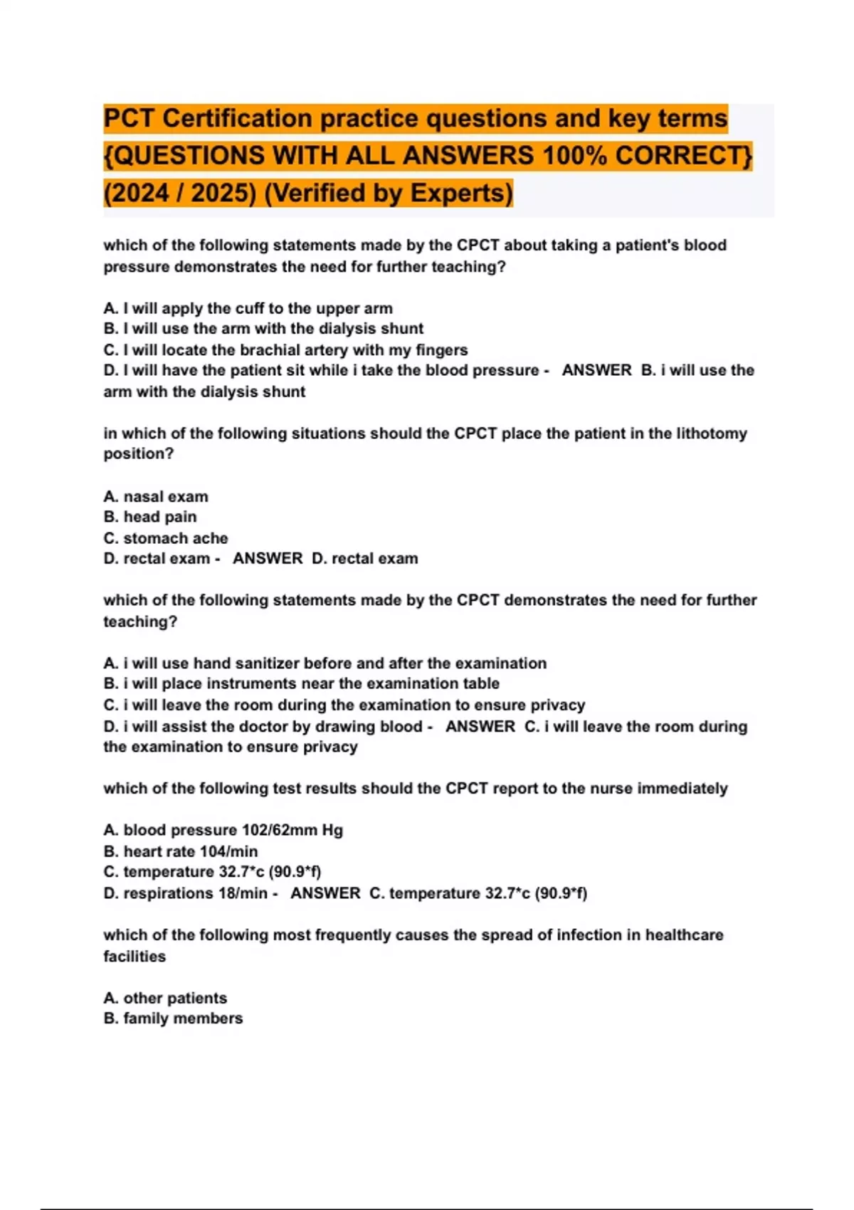 PCT Certification practice questions and key terms {QUESTIONS WITH ALL ANSWERS 100% CORRECT} (2024 / 2025) (Verified by Experts)