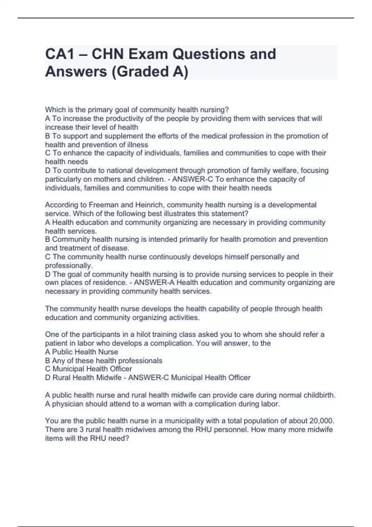 CA1 – CHN Exam Questions and Answers (Graded A)CA1 – CHN Exam Questions and Answers (Graded A)CA1 – CHN Exam Questions and Answers (Graded A)CA1 – CHN Exam Questions and Answers (Graded A)Which is the primary goal of community health nursing? A To increase the productivity of the people by providing them with services that will increase their level of health B To support and supplement the efforts of the medical profession in the promotion of health and prevention of illness C To enhance the capacity of individuals, families and communities to cope with their health needs D To contribute to national development through promotion of family welfare, focusing particularly on mothers and children. - ANSWER-C To enhance the capacity of individuals, families and communities to cope with their health needs According to Freeman and Heinrich, community health nursing is a developmental service. Which of the following best illustrates this statement? A Health education and community organizing are necessary in providing community health services. B Community health nursing is intended primarily for health promotion and prevention