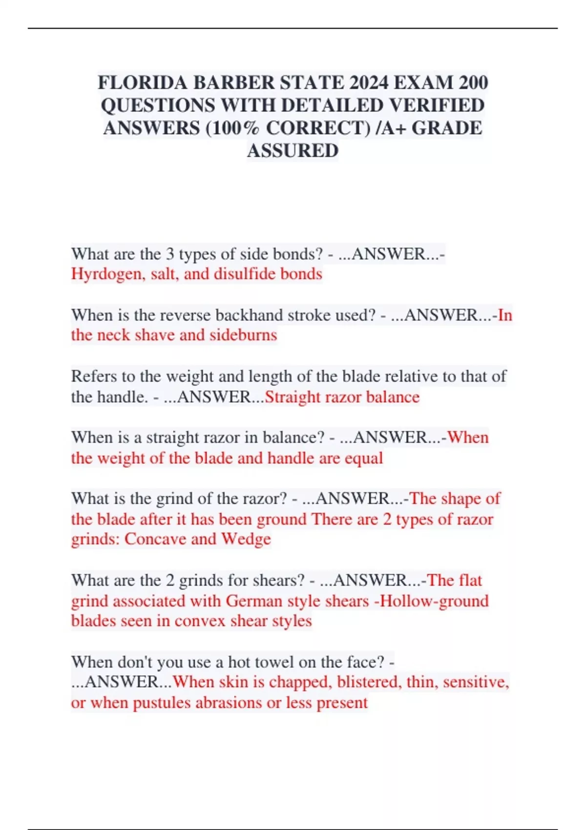 FLORIDA BARBER STATE 2024 EXAM 200 QUESTIONS WITH DETAILED VERIFIED ANSWERS (100% CORRECT) /A+ GRADE ASSURED