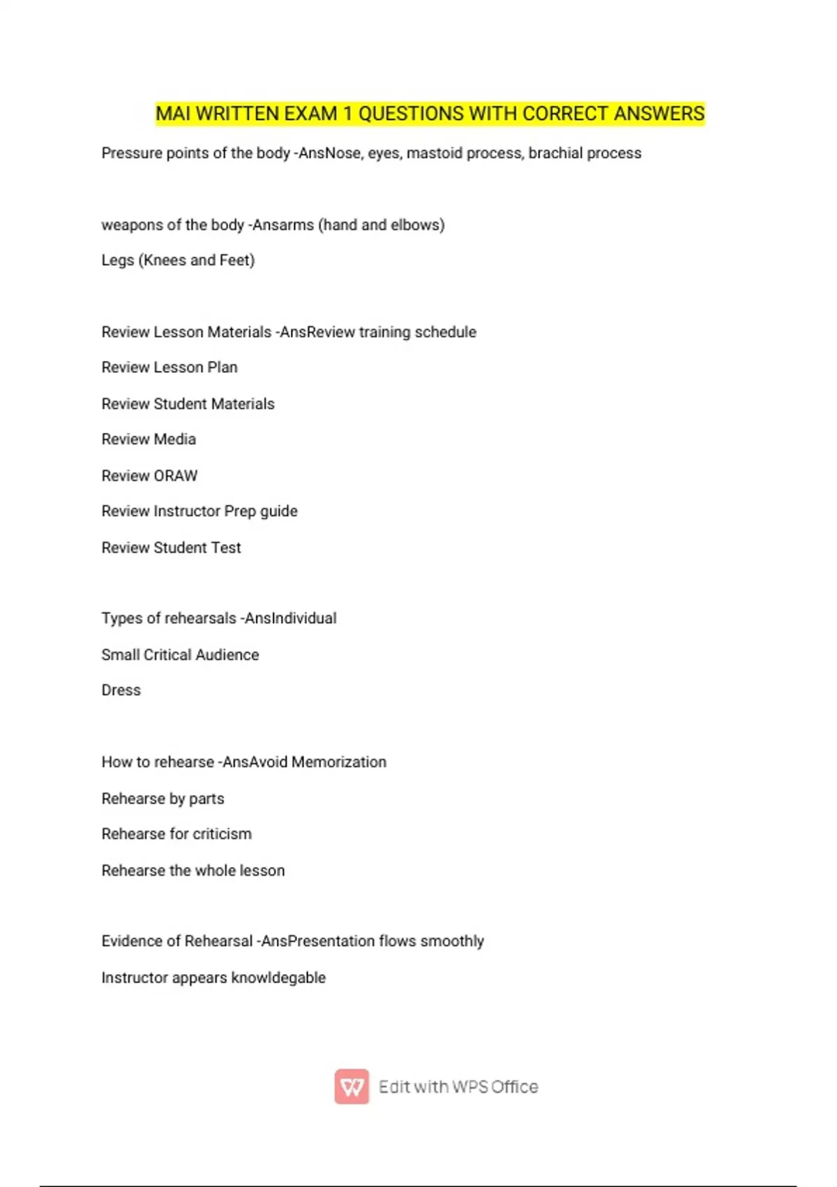 MAI WRITTEN EXAM 1 QUESTIONS WITH CORRECT ANSWERS Pressure points of the body -AnsNose, eyes, mastoid process, brachial process weapons of the body -Ansarms (hand and elbows) Legs (Knees and Feet) Review Lesson Materials -AnsReview training schedule Review Lesson Plan Review Student Materials Review Media Review ORAW Review Instructor Prep guide Review Student Test Types of rehearsals -AnsIndividual Small Critical Audience Dress How to rehearse -AnsAvoid Memorization Rehearse by parts Rehearse for criticism Rehearse the whole lesson Evidence of Rehearsal -AnsPresentation flows smoothly Instructor appears knowldegable