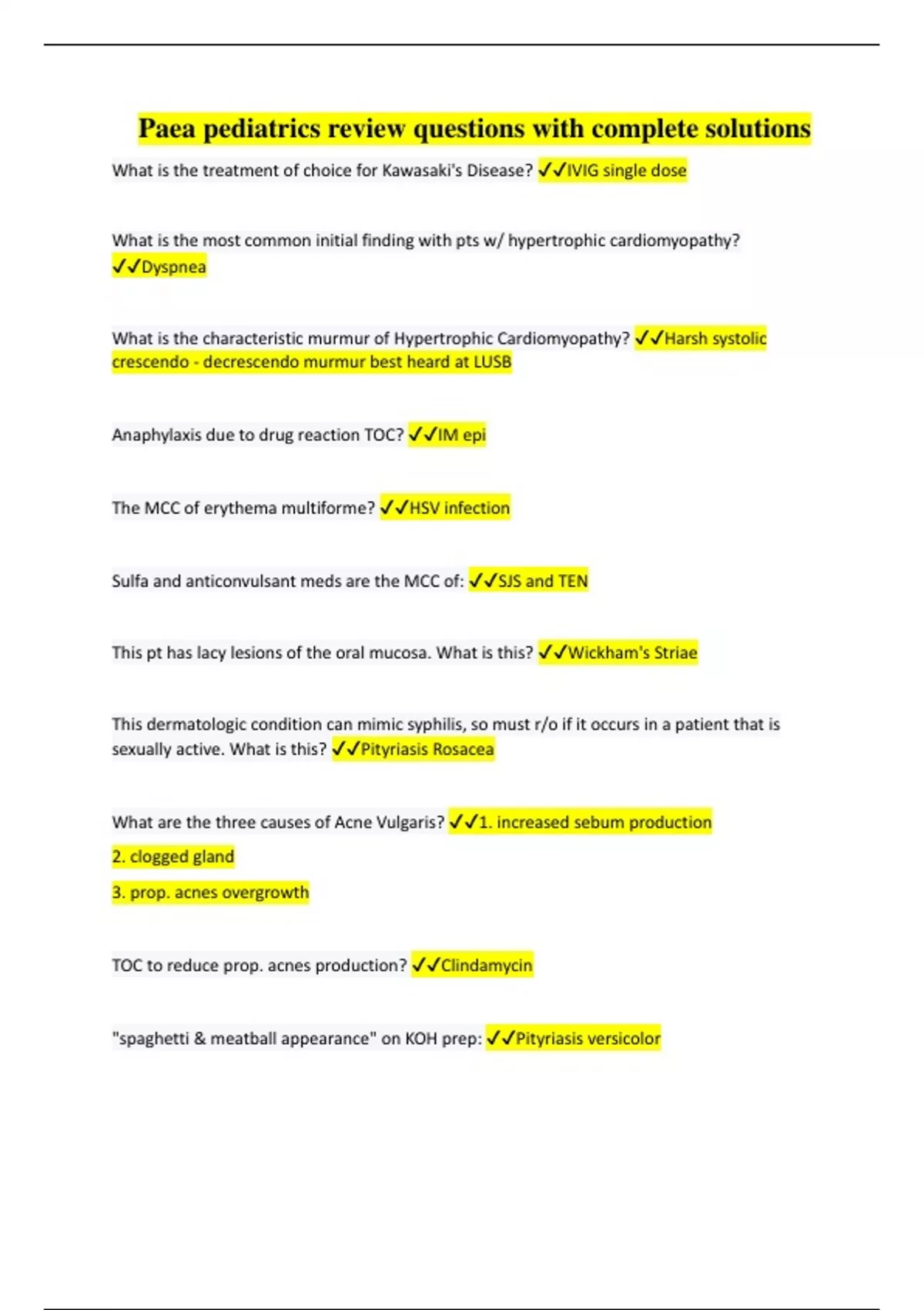 Paea pediatrics review questions with complete solutions What is the treatment of choice for Kawasaki's Disease? IVIG single dose What is the most common initial finding with pts w/ hypertrophic cardiomyopathy? Dyspnea What is the characteristic murmur of Hypertrophic Cardiomyopathy? Harsh systolic crescendo - decrescendo murmur best heard at LUSB Anaphylaxis due to drug reaction TOC? IM epi The MCC of erythema multiforme? HSV infection Sulfa and anticonvulsant meds are the MCC of: SJS and TEN This pt has lacy lesions of the oral mucosa. What is this? Wickham's Striae This dermatologic condition can mimic syphilis, so must r/o if it occurs in a patient that is sexually active. What is this? Pityriasis Rosacea What are the three causes of Acne Vulgaris? 1. increased sebum production 2. clogged gland 3. prop. acnes overgrowth TOC to reduce prop. acnes production? Clindamycin "spaghetti & meatball appearance" on KOH prep: Pityriasis versicolor