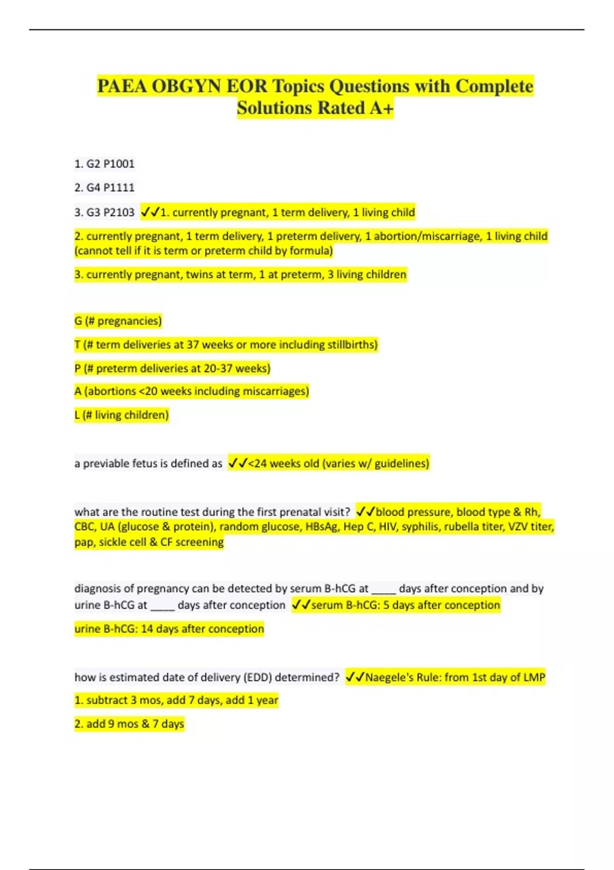 PAEA OBGYN EOR Topics Questions with Complete Solutions Rated A+ 1. G2 P1001 2. G4 P1111 3. G3 P2103 1. currently pregnant, 1 term delivery, 1 living child 2. currently pregnant, 1 term delivery, 1 preterm delivery, 1 abortion/miscarriage, 1 living child (cannot tell if it is term or preterm child by formula) 3. currently pregnant, twins at term, 1 at preterm, 3 living children G (# pregnancies) T (# term deliveries at 37 weeks or more including stillbirths) P (# preterm deliveries at 20-37 weeks) A (abortions <20 weeks including miscarriages) L (# living children) a previable fetus is defined as <24 weeks old (varies w/ guidelines) what are the routine test during the first prenatal visit? blood pressure, blood type & Rh, CBC, UA (glucose & protein), random glucose, HBsAg, Hep C, HIV, syphilis, rubella titer, VZV titer, pap, sickle cell & CF screening diagnosis of pregnancy can be detected by serum B-hCG at ____ days after conception and by urine B-hCG at ____ days after conception serum B-hCG: 5 days after conception urine B-hCG: 14 days after conception how is estimated date of delivery (EDD) determined? Naegele's Rule: from 1st day of LMP 1. subtract 3 mos, add 7 days, add 1 year 2. add 9 mos & 7 days