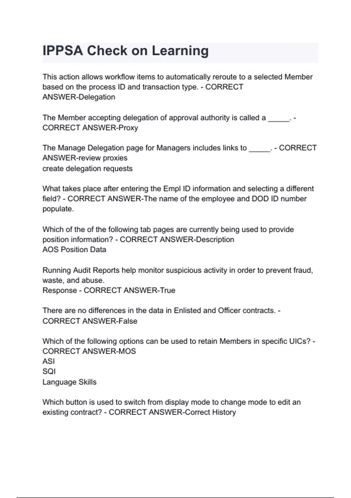 This action allows workflow items to automatically reroute to a selected Member based on the process ID and transaction type. - CORRECT ANSWER-Delegation The Member accepting delegation of approval authority is called a _____. - CORRECT ANSWER-Proxy The Manage Delegation page for Managers includes links to _____. - CORRECT ANSWER-review proxies create delegation requests What takes place after entering the Empl ID information and selecting a different field? - CORRECT ANSWER-The name of the employee and DOD ID number populate. Which of the of the following tab pages are currently being used to provide position information? - CORRECT ANSWER-Description AOS Position Data Running Audit Reports help monitor suspicious activity in order to prevent fraud, waste, and abuse. Response - CORRECT ANSWER-True There are no differences in the data in Enlisted and Officer contracts. - CORRECT ANSWER-False Which of the following options can be used to retain Members in specific UICs? - CORRECT ANSWER-MOS ASI SQI Language Skills Which button is used to switch from display mode to change mode to edit an existing c