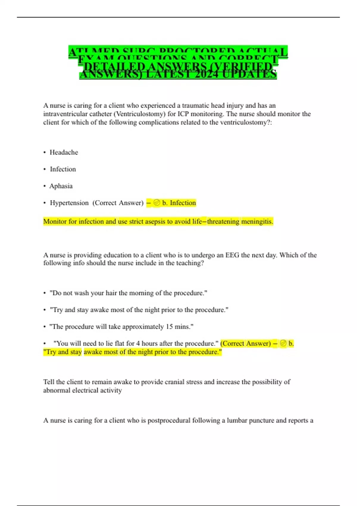 A nurse is caring for a client who experienced a traumatic head injury and has an intraventricular catheter (Ventriculostomy) for ICP monitoring. The nurse should monitor the client for which of the following complications related to the ventriculostomy?: Headache Infection Aphasia Hypertension (Correct Answer) − b. Infection Monitor for infection and use strict asepsis to avoid life−threatening meningitis. A nurse is providing education to a client who is to undergo an EEG the next day. Which of the following info should the nurse include in the teaching? "Do not wash your hair the morning of the procedure." "Try and stay awake most of the night prior to the procedure." "The procedure will take approximately 15 mins." "You will need to lie flat for 4 hours after the procedure." (Correct Answer) − b. "Try and stay awake most of the night prior to the procedure." Tell the client to remain awake to provide cranial stress and increase the possibility of abnormal electrical activity A nurse is caring for a client who is postprocedural following a lumbar puncture and reports a throbbing headache when sitting upright. Which of the following actions should the nurse take? SATA. Use the GCS scale to assess the client Assist the client into a supine position Administer an opioid analgesic Encourage the client to increase PO fluid intake Instruct the client to perform coughing and deep breathing (Correct Answer) − B, D A nurse is caring for a client who has continuous bladder irrigation following a transurethral resection of the prostate (TURP). Which of the following findings should the nurse report to the provider? a Output equal to the instilled irrigate Client reports bladder spasms Viscous urinary output with clots Reports of strong urge to urinate (Correct Answer) − c. Viscous urinary output with clots Urine that is bright red with clots is an indication of arterial bleeding. A nurse is monitoring the ECG of a client who has hypocalcemia. Which of the following findings should the nurse expect? Flattened T waves Prolonged QT intervals Shortened QT intervals d Widened QRS complexes (Correct Answer) − b. Prolonged QT intervals Manifestations of hypocalcemia include tingling, numbness, tetany, seizures, prolonged QT intervals, and laryngospasm. A nurse is preparing a client who has a brain tumor for a CT scan. Which of the following factors affects the manner in which the nurse will prepare the client for the scan? No food or fluids consumed for 4 hours Difficulty recalling recent events Development of hives while eating shrimp d. e. Paresthesia in both hands (Correct Answer) − c. Development of hives while eating shrimp Shellfish allergy is contraindication of use of contrast media during a CT scan. A nurse is preparing an in−service program about the stages of acute kidney injury. Which of the following pieces of info should the nurse include about prerenal azotemia? Prerenal azotemia begins prior to the onset of symptoms Interference with renal perfusion causes renal azotemia Prerenal azotemia is irreversible, even in early stages Infections and tumors cause prerenal azotemia (Correct Answer) − b. Interference with renal perfusion causes prerenal azotemia. Prerenal = interference with renal perfusion, such as from heart failure or hypovolemic shock. A nurse is teaching a client who has CAD about the difference between angina pectoris and MI. Which of the following should the nurse identify as indications of MI? SATA. N/V Diaphoresis and dizziness Chest and left arm pain that subsides with rest Anxiety and feelings of doom Bounding pulse and bradypnea (Correct Answer) − A, B, D A nurse is reviewing the lab results of a lumbar puncture for a client who has manifestations of bacterial meningitis. Which of the following findings should the nurse expect? Elevated glucose Elevated protein Presence of RBCs Presence of D−dimer (Correct Answer) − b. Elevated protein Manifestations of bacterial meningitis include increase protein in the CSF, decreased glucose. RBCs can indicate bleeding, however, WBCs are what indicates bacterial meningitis. A nurse is providing teaching to a client who has a new diagnosis of myasthenia gravis (MG). Which of the following pieces of information should the nurse include? Use enemas to treat constipation caused by daily medications Take a hot bath when muscles ache Eat a low−calorie diet Set an alarm to ensure medication dosages are taken on time (Correct Answer) − D. Set an alarm to ensure medication dosages are taken on time