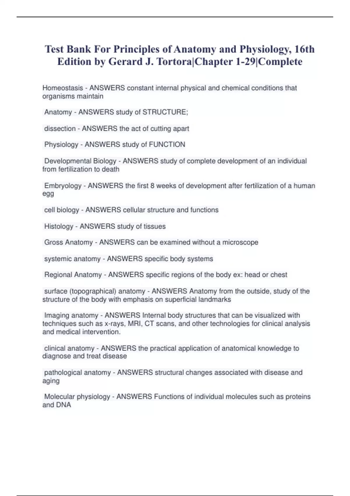 Test Bank For Principles of Anatomy and Physiology, 16th Edition by Gerard J. Tortora|Chapter 1-29|Complete Homeostasis - ANSWERS constant internal physical and chemical conditions that organisms maintain Anatomy - ANSWERS study of STRUCTURE; dissection - ANSWERS the act of cutting apart Physiology - ANSWERS study of FUNCTION Developmental Biology - ANSWERS study of complete development of an individual from fertilization to death Embryology - ANSWERS the first 8 weeks of development after fertilization of a human egg cell biology - ANSWERS cellular structure and functions Histology - ANSWERS study of tissues Gross Anatomy - ANSWERS can be examined without a microscope systemic anatomy - ANSWERS specific body systems Regional Anatomy - ANSWERS specific regions of the body ex: head or chest surface (topographical) anatomy - ANSWERS Anatomy from the outside, study of the structure of the body with emphasis on superficial landmarks Imaging anatomy - ANSWERS Internal body structures that can be visualized with techniques such as x-rays, MRI, CT scans, and other technologies for clinical analysis and medical intervention. clinical anatomy - ANSWERS the practical application of anatomical knowledge to diagnose and treat disease pathological anatomy - ANSWERS structural changes associated with disease and aging Molecular physiology - ANSWERS Functions of individual molecules such as proteins and DNA Neurophysiology - ANSWERS Functional properties of nerve cells endocrinology - ANSWERS study of hormones, hormone-secreting glands, and their diseases Horomones - ANSWERS chemical regulators released by glands, through the blood, to send messages to cells Cardiovascular physiology - ANSWERS function of the heart & blood vessels Immunology - ANSWERS Body's resistance to disease causing agents respiratory physiology - ANSWERS functions of the air passageways and lungs Renal Physiology - ANSWERS kidney function and urine production Exercise Physiology - ANSWERS Changes in cell and organ functions due to muscular activity Pathophysiology - ANSWERS Functional changes associated with disease and aging Levels of Structural Organization: Lowest to Highest - ANSWERS 1. Chemical 2. cellular 3. tissue 4. organ 5. organ system 6. body Atom - ANSWERS smallest unit of matter Molecule - ANSWERS A group of atoms bonded together Atoms essential for maintaining life - ANSWERS carbon, hydrogen, oxygen, nitrogen, phosphorus, calcium, sulfur molecules combine to form - ANSWERS cells, the basic unit of all life tissue level - ANSWERS groups of similar cells that have a common function organ level - ANSWERS Organs are made up of different types of tissues joined organ system level - ANSWERS related organs with a common function pancreas is part of - ANSWERS both the digestive system and the endocrine system Organismic level - ANSWERS the entire body consisting of the various organ systems. noninvasive diagnostic technique - ANSWERS one that does not involve insertion of an instrument or device through the skin or a body opening Palpation - ANSWERS examining by touch, the examiner's hands are used to feel the texture, size, consistency, and location of certain body parts ascultation - ANSWERS listening to sounds of the body, such as heart, blood vessels, lungs, abdomen, etc... percussion - ANSWERS to determine the density of a body part by the sound produced by tapping the surface with the fingers integumentary system - ANSWERS skin, hair, nails, sweat glands, sebaceous glands integumentary system functions - ANSWERS Protects body; regulates body temperature, eliminates some wastes; makes vitamin D; detects sensations like touch, pain, warmth, and cold; stores fat, provides insulation skeletal system - ANSWERS bones, joints, cartilage, ligaments skeletal system functions