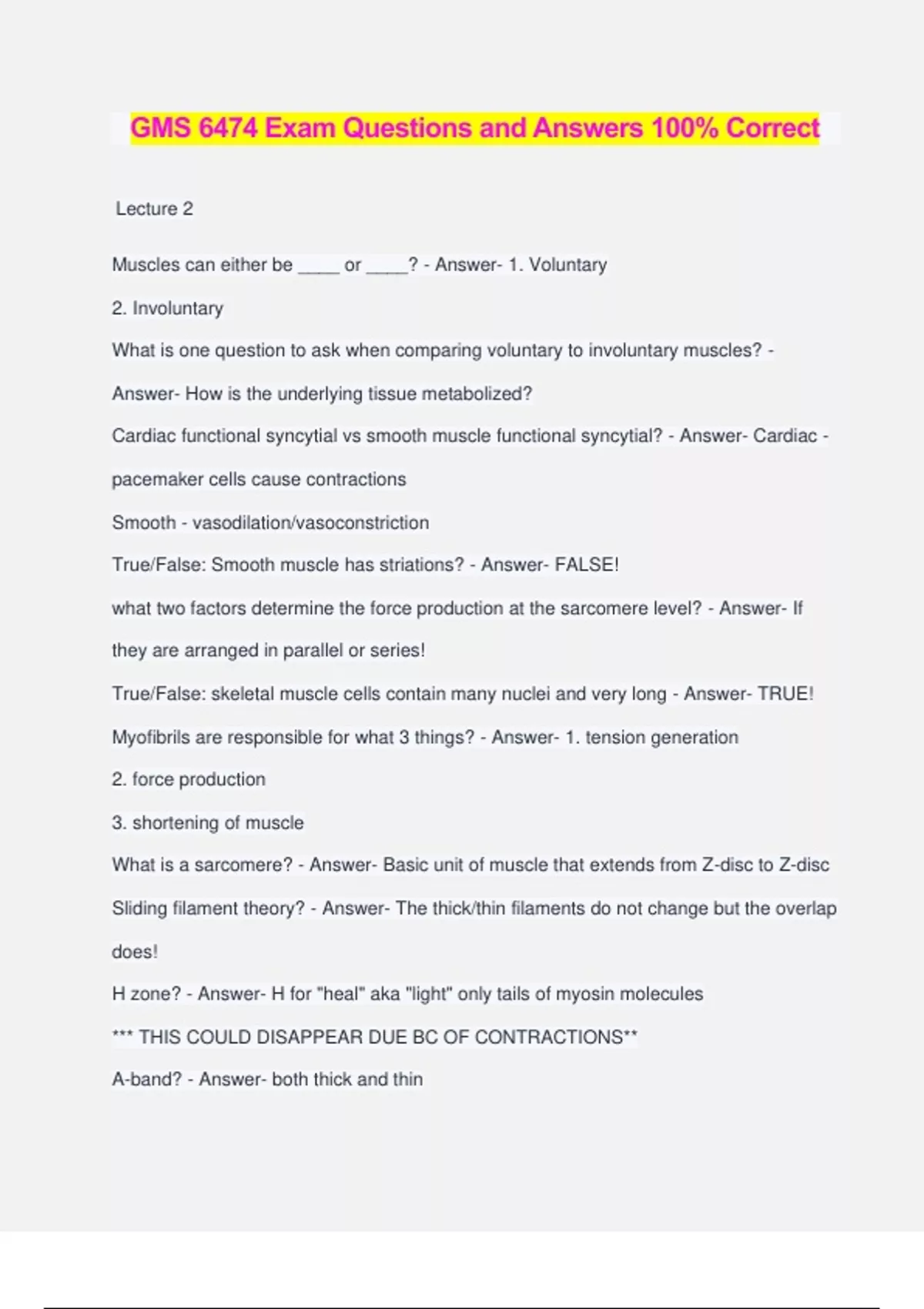 GMS 6474 Exam Questions and Answers 100% Correct Lecture 2 Muscles can either be ____ or ____? - Answer- 1. Voluntary 2. Involuntary What is one question to ask when comparing voluntary to involuntary muscles? - Answer- How is the underlying tissue metabolized? Cardiac functional syncytial vs smooth muscle functional syncytial? - Answer- Cardiac - pacemaker cells cause contractions Smooth - vasodilation/vasoconstriction True/False: Smooth muscle has striations? - Answer- FALSE! what two factors determine the force production at the sarcomere level? - Answer- If they are arranged in parallel or series! True/False: skeletal muscle cells contain many nuclei and very long - Answer- TRUE! Myofibrils are responsible for what 3 things? - Answer- 1. tension generation 2. force production 3. shortening of muscle What is a sarcomere? - Answer- Basic unit of muscle that extends from Z-disc to Z-disc Sliding filament theory? - Answer- The thick/thin filaments do not change but the overlap does! H zone? - Answer- H for "heal" aka "light" only tails of myosin molecules *** THIS COULD DISAPPEAR DUE BC OF CONTRACTIONS** A-band? - Answer- both thick and thin I band? - Answer- only thin - extends both sides of the z-disc ***THIS WILL SHORTEN IF THE MUSCLE CONTRACTS*** What is a triad? - Answer- SR, T Tubule, SR Why is T-Tubule important? - Answer- muscle cells are really long so there needs to be something that connects the outside with the inside **allows for better communication system** ** action potentials would not reach the myofibrils if it werent for the T-tubules*** True/False: SR keeps Ca levels low? - Answer- TRUE! Lecture 3 - Answer- What are the 3 parts of the thick filament? - Answer- 1. tail 2. hinge aka neck 3. head Which part is responsible for the ATP activity? Aka the binding and splitting of ATP? - Answer- Head Specifically? - Answer- Myosin heavy chains The myosin light chains are responsible for what? - Answer- Modulating the ATP activity in cardiac/skeletal muscle When inidividual myosin molecules are placed in a ionic and salt solution, what happens? - Answer- The myosin heads will join together and tails will dimerize to form one thick cross bridge filament another reminder....what part of the myosin is responsible for the ATP activity? - Answer- The myosin heavy chains on the myosin heads what protein is responsible for in participating in the bipolar arrangement and packing into sarcomere? - Answer- Myomicin C protein Which protein holds the myosin heads together, instead of leaving them in space? - Answer- titin (attaches myosin to z disc) thin filament is what? - Answer- actin heavy chains of myosin are going to act upon what? - Answer- THE ACTIN! G actin vs F actin? - Answer- Glomerular vs filamentous What protein strand hides the active site on the actin? - Answer- Tropomyosin Which part of troponin is acted upon Ca? - Answer- C which two proteins anchor the thin filament to the Z-disc? - Answer- 1. alpha-actinin 2. capZ Z disc is made up of which two proteins - Answer- alpha actinin and CapZ Which component attaches the sarcolemma to the outside filaments/collagen? - Answer- Dystrophin Associated Complex _________ links the DAC with the extracellular matrix? - Answer- Laminin-2 (attaches to alpha/beta dystroglycans) a,b,g,d sarcoglycans are inside of the sarcolemma and are held together by what? - Answer- sarcospan Dystrophin anchors actin on what terminus? - Answer- N' C' terminus anchors what? - Answer- nNOS to border of sarcolemma Desmin is imp for what? - Answer- connects outside to inside Lecture 4 - Answer- Motor neurons that innervate the same muscle fiber will have the same ___ and ____? - Answer- metabolic, contractile phenotypes True/False: The muscle side of the neuromuscular junction is highly folded - Answer- TRUE! Ach diffuses across synaptic cleft and binds to ______ receptors? - Answer- nicotinic what happens when Ach binds to these ligand-gated receptors? - Answer- Na+ and K+ permeability increases! ---- End plate potential occurs true/false: the end-plate potential is stationary so it will only stay w/i the NM junction? - Answer- TRUE!