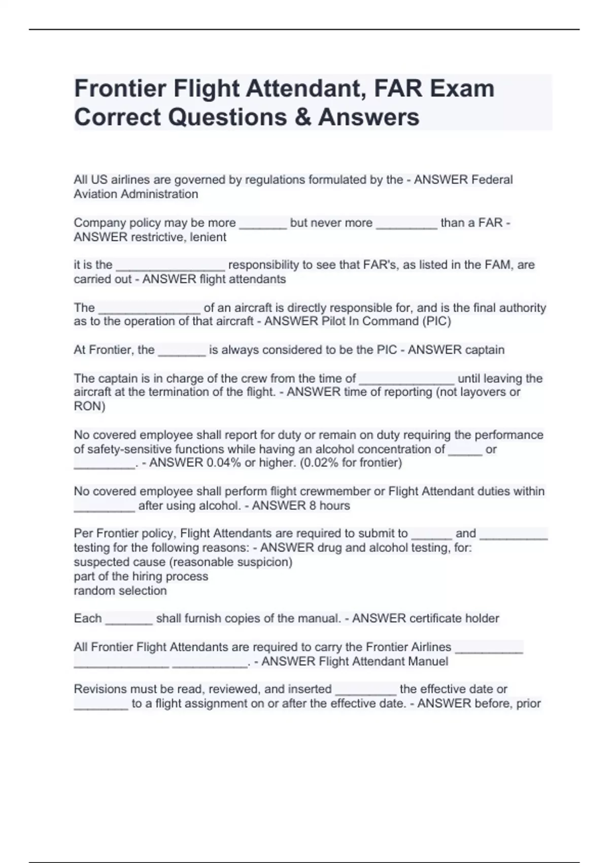 Frontier Flight Attendant, FAR Exam Correct Questions & Answers