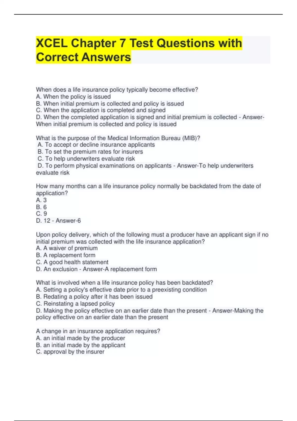 XCEL Chapter 7 Test Questions with Correct Answers When does a life insurance policy typically become effective? A. When the policy is issued B. When initial premium is collected and policy is issued C. When the application is completed and signed D. When the completed application is signed and initial premium is collected - Answer-When initial premium is collected and policy is issued What is the purpose of the Medical Information Bureau (MIB)? A. To accept or decline insurance applicants B. To set the premium rates for insurers C. To help underwriters evaluate risk D. To perform physical examinations on applicants - Answer-To help underwriters evaluate risk How many months can a life insurance policy normally be backdated from the date of application? A. 3 B. 6 C. 9 D. 12 - Answer-6 Upon policy delivery, which of the following must a producer have an applicant sign if no initial premium was collected with the life insurance application? A. A waiver of premium B. A replacement form C. A good health statement D. An exclusion - Answer-A replacement form What is involved when a life insurance policy has been backdated? A. Setting a policy's effective date prior to a preexisting condition B. Redating a policy after it has been issued C. Reinstating a lapsed policy D. Making the policy effective on an earlier date than the present - Answer-Making the policy effective on an earlier date than the present