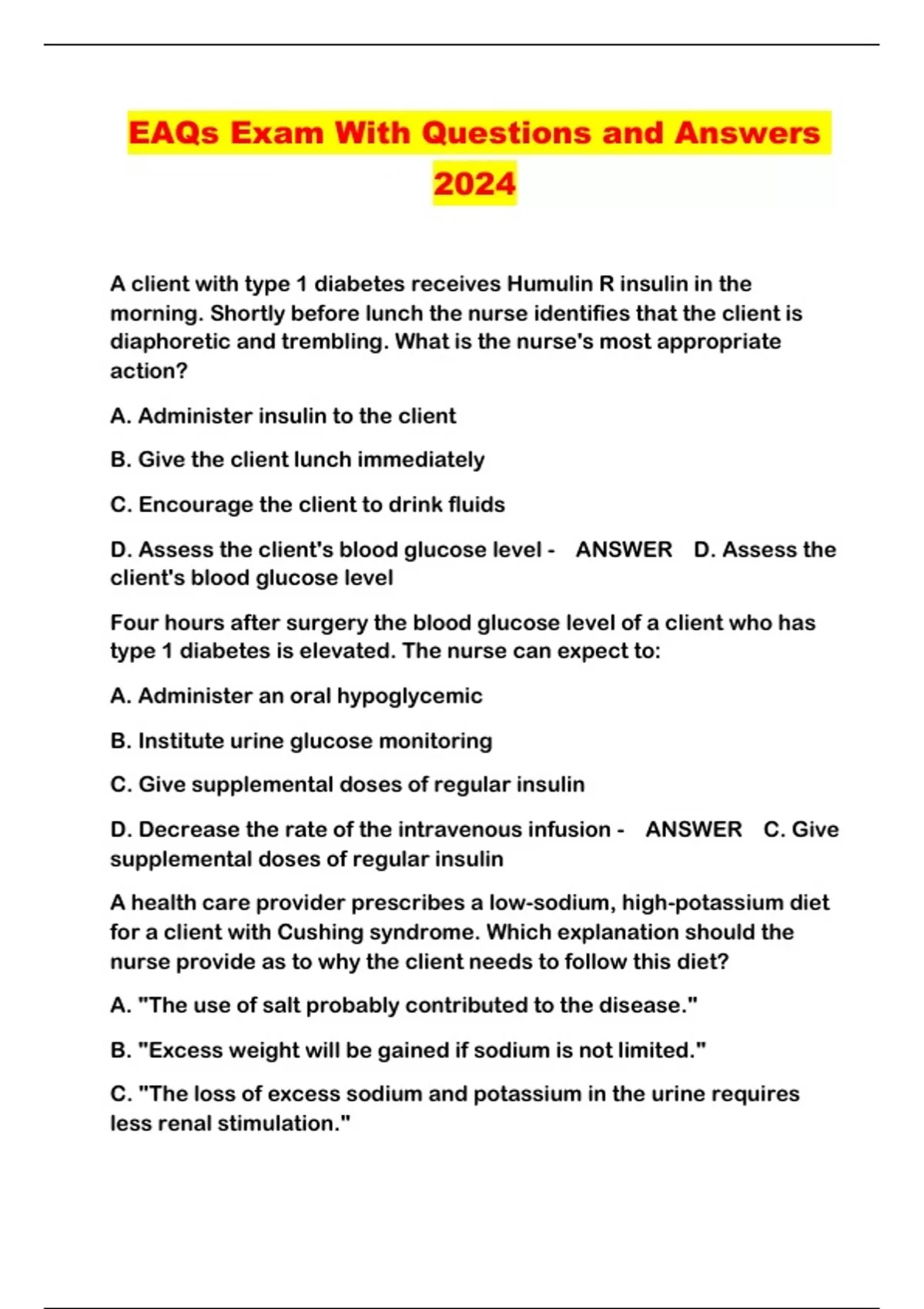 EAQs Exam With Questions and Answers 2024 A client with type 1 diabetes receives Humulin R insulin in the morning. Shortly before lunch the nurse identifies that the client is diaphoretic and trembling. What is the nurse's most appropriate action? A. Administer insulin to the client B. Give the client lunch immediately C. Encourage the client to drink fluids D. Assess the client's blood glucose level - ANSWER D. Assess the client's blood glucose level Four hours after surgery the blood glucose level of a client who has type 1 diabetes is elevated. The nurse can expect to: A. Administer an oral hypoglycemic B. Institute urine glucose monitoring C. Give supplemental doses of regular insulin D. Decrease the rate of the intravenous infusion - ANSWER C. Give supplemental doses of regular insulin A health care provider prescribes a low-sodium, high-potassium diet for a client with Cushing syndrome. Which explanation should the nurse provide as to why the client needs to follow this diet? A. "The use of salt probably contributed to the disease." B. "Excess weight will be gained if sodium is not limited." C. "The loss of excess sodium and potassium in the urine requires less renal stimulation." D. "Excessive aldosterone and cortisone cause retention of sodium and loss of potassium." - ANSWER D. "Excessive aldosterone and cortisone cause retention of sodium and loss of potassium." When providing care for a client in the first 24 hours after a thyroidectomy, the nurse should: A. Check the back and sides of the operative site B. Support the head during mild range- of-motion (ROM) exercises C. Encourage the client to ventilate feelings about the surgery D. Advise the client that regular activities can be resumed immediately - ANSWER A. Check the back and sides of the operative site The nurse is performing an assessment and notes that the client has exophthalmos and complains of double vision. These assessment findings are found with which condition? A. Glaucoma B. Hypertension C. Hyperthyroidism D. Sinus infection - ANSWER C. Hyperthyroidism A nurse plans an evening snack of milk, crackers, and cheese for a client who is receiving NPH insulin (Novolin N). What does this snack provide? A. Encouragement to stay on the diet B. Added calories to promote weight gain C. Nourishment to counteract late insulin activity D. High-carbohydrate nourishment for immediate use - ANSWER C. Nourishment to counteract late insulin activity A nurse notes that a client's urine has a sweet fruity odor. Which information is most important to evaluate when performing a further client assessment? A. Vital signs B. Fluid balance C. Serum glucose level D. Dietary calorie count - ANSWER C. Serum glucose level A nurse plans to set up emergency equipment at the bedside of a client in the immediate postoperative period after a thyroidectomy. What should the nurse include in the bedside setup? A.Crash cart with bed board B.Tracheostomy set and oxygen C.Ampule of sodium bicarbonate D.Airway and nonrebreather mask - ANSWER B.Tracheostomy set and oxygen The nurse is assessing the client admitted with diabetic ketoacidosis. The nurse knows the client needs further education on sick day management when the client states: A. "I need to stop taking my insulin when I am ill because I am not eating." B. "I will check my urine for ketones when my blood sugar is over 250." C. "I will try and take in Gatorade and water when I am sick." D. "I will continue all my insulin including my lantus when I am sick. - ANSWER A. "I need to stop taking my insulin when I am ill because I am not eating." Reasoning: The diabetic client's metabolic needs will require the