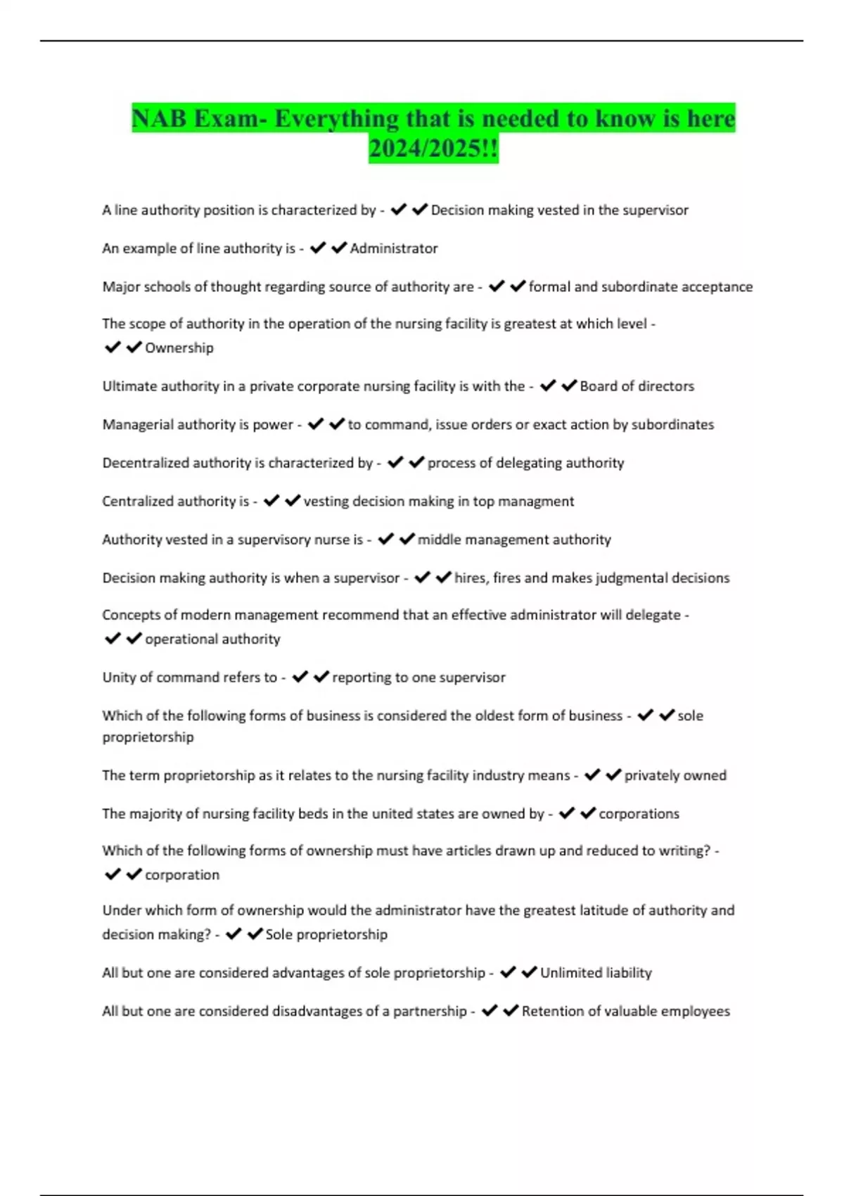 Ultimate authority in a private corporate nursing facility is with the - ✔✔Board of directors