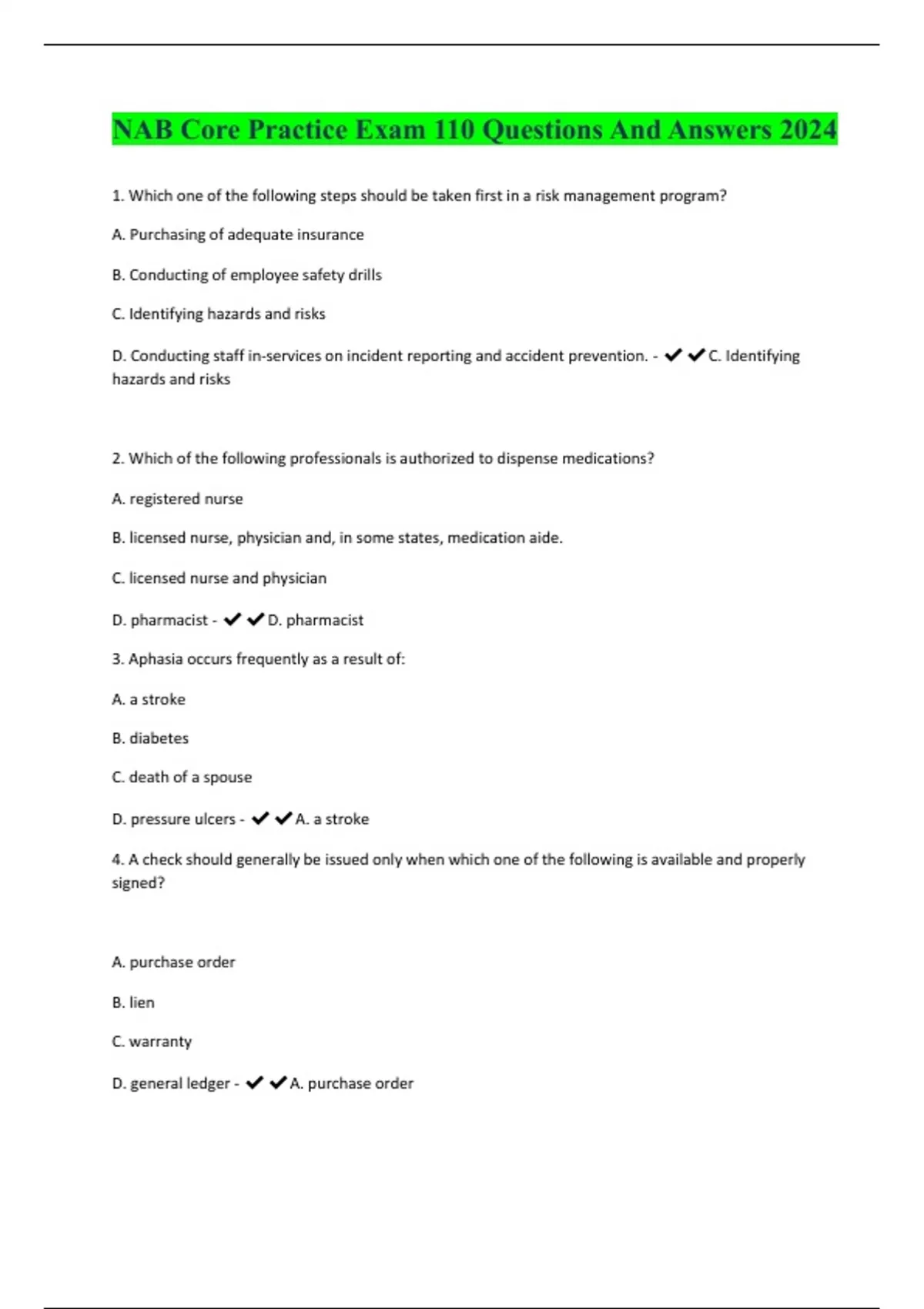 NAB Core Practice Exam 110 Questions And Answers 2024 1. Which one of the following steps should be taken first in a risk management program? A. Purchasing of adequate insurance B. Conducting of employee safety drills C. Identifying hazards and risks D. Conducting staff in-services on incident reporting and accident prevention. - C. Identifying hazards and risks 2. Which of the following professionals is authorized to dispense medications? A. registered nurse B. licensed nurse, physician and, in some states, medication aide. C. licensed nurse and physician D. pharmacist - D. pharmacist 3. Aphasia occurs frequently as a result of: A. a stroke B. diabetes C. death of a spouse D. pressure ulcers - A. a stroke 4. A check should generally be issued only when which one of the following is available and properly signed? A. purchase order B. lien C. warranty D. general ledger - A. purchase order