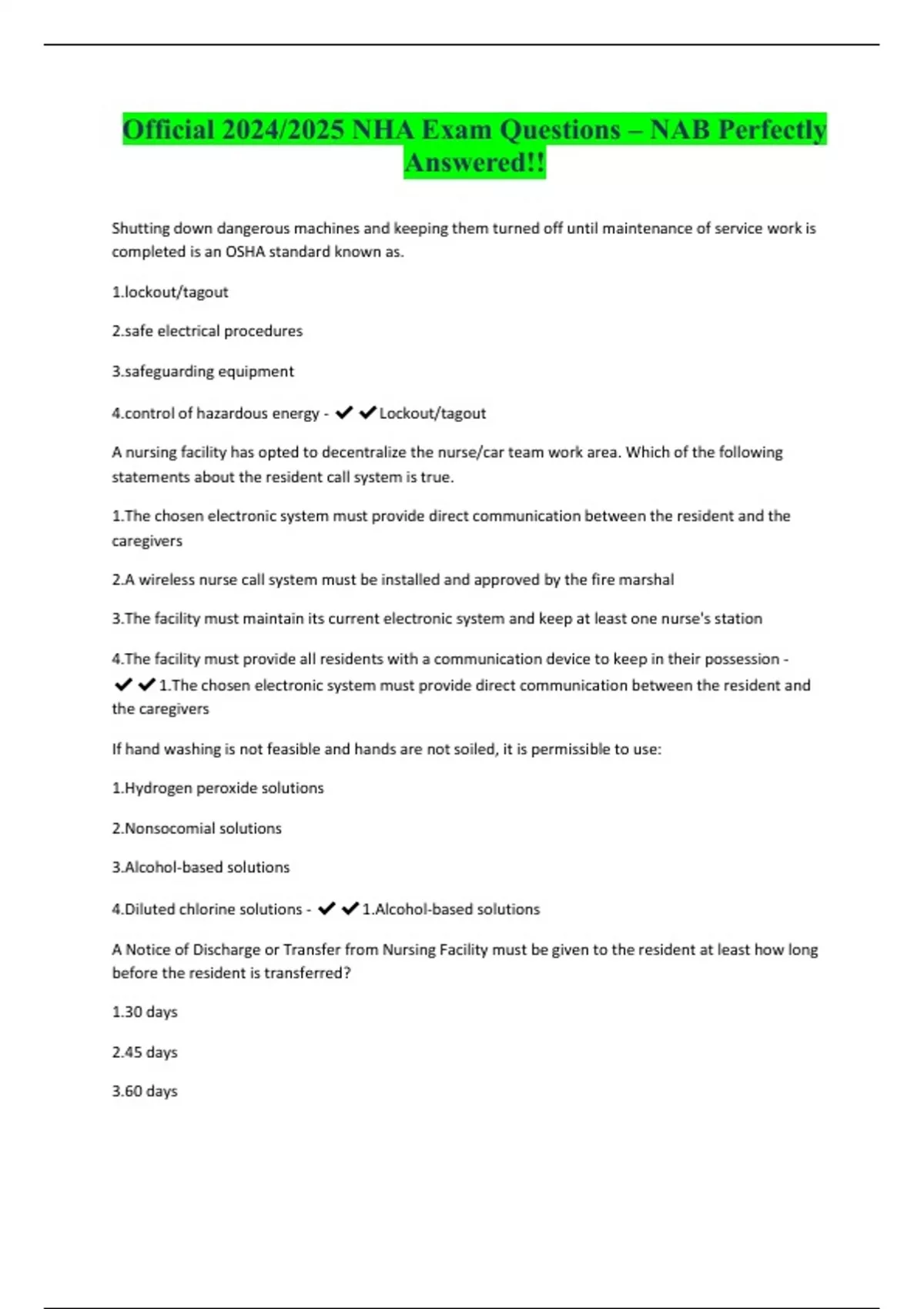 Official 2024/2025 NHA Exam Questions – NAB Perfectly Answered!! Shutting down dangerous machines and keeping them turned off until maintenance of service work is completed is an OSHA standard known as. ut/tagout electrical procedures uarding equipment ol of hazardous energy - Lockout/tagout A nursing facility has opted to decentralize the nurse/car team work area. Which of the following statements about the resident call system is true. 1.The chosen electronic system must provide direct communication between the resident and the caregivers 2.A wireless nurse call system must be installed and approved by the fire marshal 3.The facility must maintain its current electronic system and keep at least one nurse's station 4.The facility must provide all residents with a communication device to keep in their possession - 1.The chosen electronic system must provide direct communication between the resident and the caregivers If hand washing is not feasible and hands are not soiled, it is permissible to use: 1.Hydrogen peroxide solutions 2.Nonsocomial solutions 3.Alcohol-based solutions 4.Diluted chlorine solutions - 1.Alcohol-based solutions A Notice of Discharge or Transfer from Nursing Facility must be given to the resident at least how long before the resident is transferred? 1.30 days 2.45 days 3.60 days