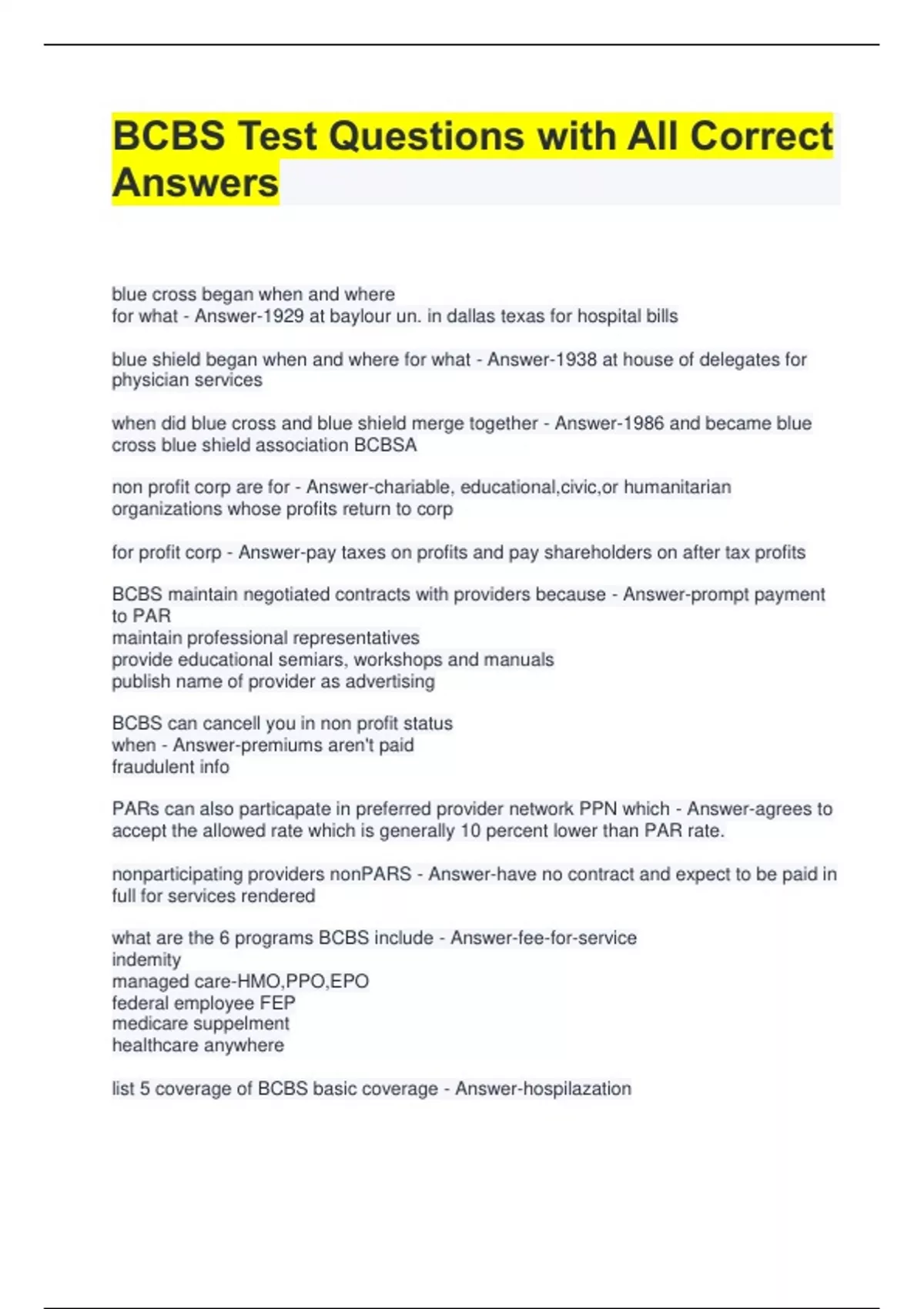 BCBS Test Questions with All Correct Answers blue cross began when and where for what - Answer-1929 at baylour un. in dallas texas for hospital bills blue shield began when and where for what - Answer-1938 at house of delegates for physician services when did blue cross and blue shield merge together - Answer-1986 and became blue cross blue shield association BCBSA non profit corp are for - Answer-chariable, educational,civic,or humanitarian organizations whose profits return to corp for profit corp - Answer-pay taxes on profits and pay shareholders on after tax profits BCBS maintain negotiated contracts with providers because - Answer-prompt payment to PAR maintain professional representatives provide educational semiars, workshops and manuals publish name of provider as advertising BCBS can cancell you in non profit status when - Answer-premiums aren't paid fraudulent info PARs can also particapate in preferred provider network PPN which - Answer-agrees to accept the allowed rate which is generally 10 percent lower than PAR rate. nonparticipating providers nonPARS - Answer-have no contract and expect to be paid in full for services rendered what are the 6 programs BCBS include - Answer-fee-for-service indemity managed care-HMO,PPO,EPO federal employee FEP medicare suppelment healthcare anywhere list 5 coverage of BCBS basic coverage - Answer-hospilazation