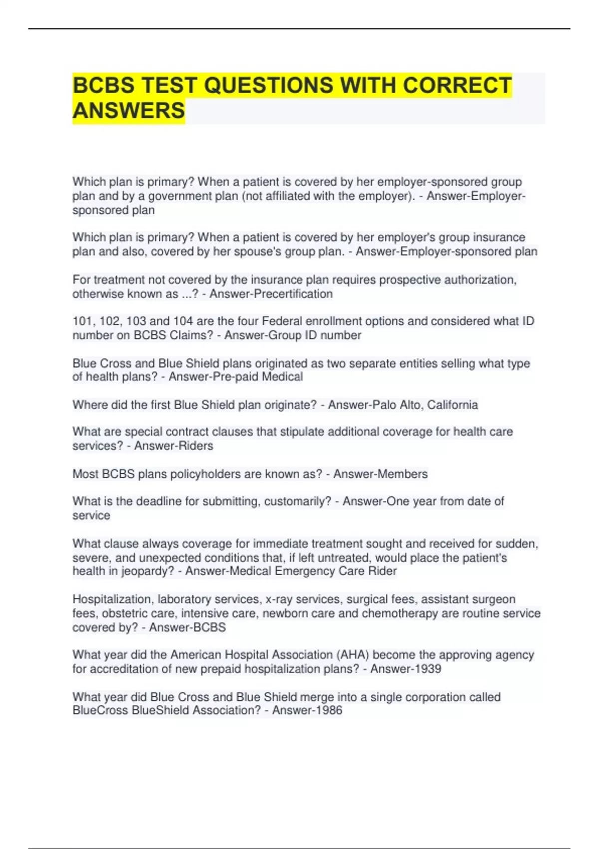 BCBS TEST QUESTIONS WITH CORRECT ANSWERS Which plan is primary? When a patient is covered by her employer-sponsored group plan and by a government plan (not affiliated with the employer). - Answer-Employersponsored plan Which plan is primary? When a patient is covered by her employer's group insurance plan and also, covered by her spouse's group plan. - Answer-Employer-sponsored plan For treatment not covered by the insurance plan requires prospective authorization, otherwise known as ...? - Answer-Precertification 101, 102, 103 and 104 are the four Federal enrollment options and considered what ID number on BCBS Claims? - Answer-Group ID number