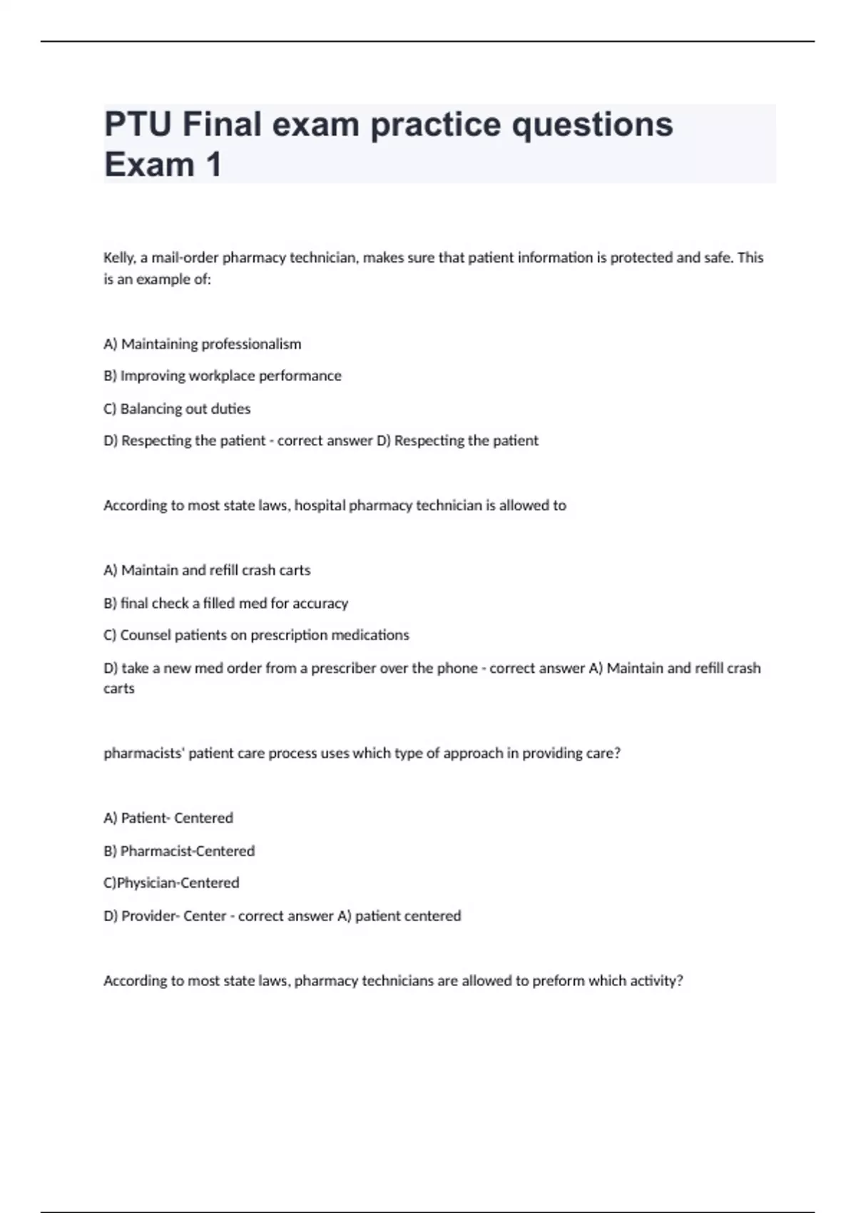 PTU Final exam practice questions Exam 1Kelly, a mail-order pharmacy technician, makes sure that patient information is protected and safe. This is an example of: A) Maintaining professionalism B) Improving workplace performance C) Balancing out duties D) Respecting the patient - correct answer D) Respecting the patient According to most state laws, hospital pharmacy technician is allowed to A) Maintain and refill crash carts B) final check a filled med for accuracy C) Counsel patients on prescription medications D) take a new med order from a prescriber over the phone - correct answer A) Maintain and refill crash carts pharmacists' patient care process uses which type of approach in providing care? A) Patient- Centered B) Pharmacist-Centered C)Physician-Centered D) Provider- Center - correct answer A) patient centered According to most state laws, pharmacy technicians are allowed to preform which activity? A)Counsel Patients on prescription medications B)Make the final check of a completed prescription C)Order medications from the pharmacy's wholesalers D) Work in a pharmacy when a pharmacist is not present - correct answer C) Order medications from the patients wholesaler According to the definition of a pharmacy technician, the primary role of a pharmacy technician is to A)Provide patient-centered care B)Assist the pharmacist with dispensing prescriptions C) Counsel patients on medications and medical conditions D)Bill insurance companies for medical and prescription claims - correct answer B) Assist the pharmacist with dispensing prescriptions Which employee may also preform tasks that a pharmacist preforms A)Clerk B) Intern C) Supervisor D)Technician - correct answer B) Intern A long term care pharmacy technician is most likely to prepare meds for which type of patient - correct answer Nursing home Im which setting is a technician most likely to assist at drop off - correct answer Community Mr. Cook takes Lamictal for seizure control. According to most state laws, as a mail order pharmacy technician, you will: A) have face-to-face interaction w/Mr. Cook each time he gets a refill