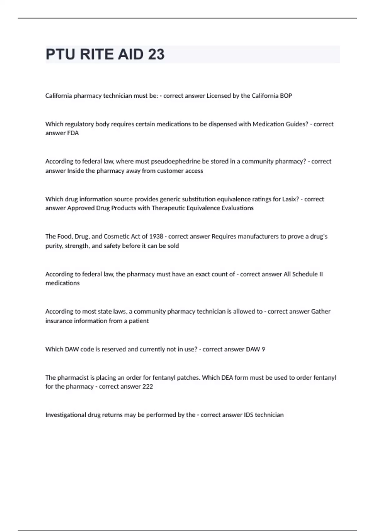PTU RITE AID 23California pharmacy technician must be: - correct answer Licensed by the California BOP Which regulatory body requires certain medications to be dispensed with Medication Guides? - correct answer FDA According to federal law, where must pseudoephedrine be stored in a community pharmacy? - correct answer Inside the pharmacy away from customer access Which drug information source provides generic substitution equivalence ratings for Lasix? - correct answer Approved Drug Products with Therapeutic Equivalence Evaluations The Food, Drug, and Cosmetic Act of 1938 - correct answer Requires manufacturers to prove a drug's purity, strength, and safety before it can be sold According to federal law, the pharmacy must have an exact count of - correct answer All Schedule II medications According to most state laws, a community pharmacy technician is allowed to - correct answer Gather insurance information from a patient Which DAW code is reserved and currently not in use? - correct answer DAW 9 The pharmacist is placing an order for fentanyl patches. Which DEA form must be used to order fentanyl for the pharmacy - correct answer 222 Investigational drug returns may be performed by the - correct answer IDS technician