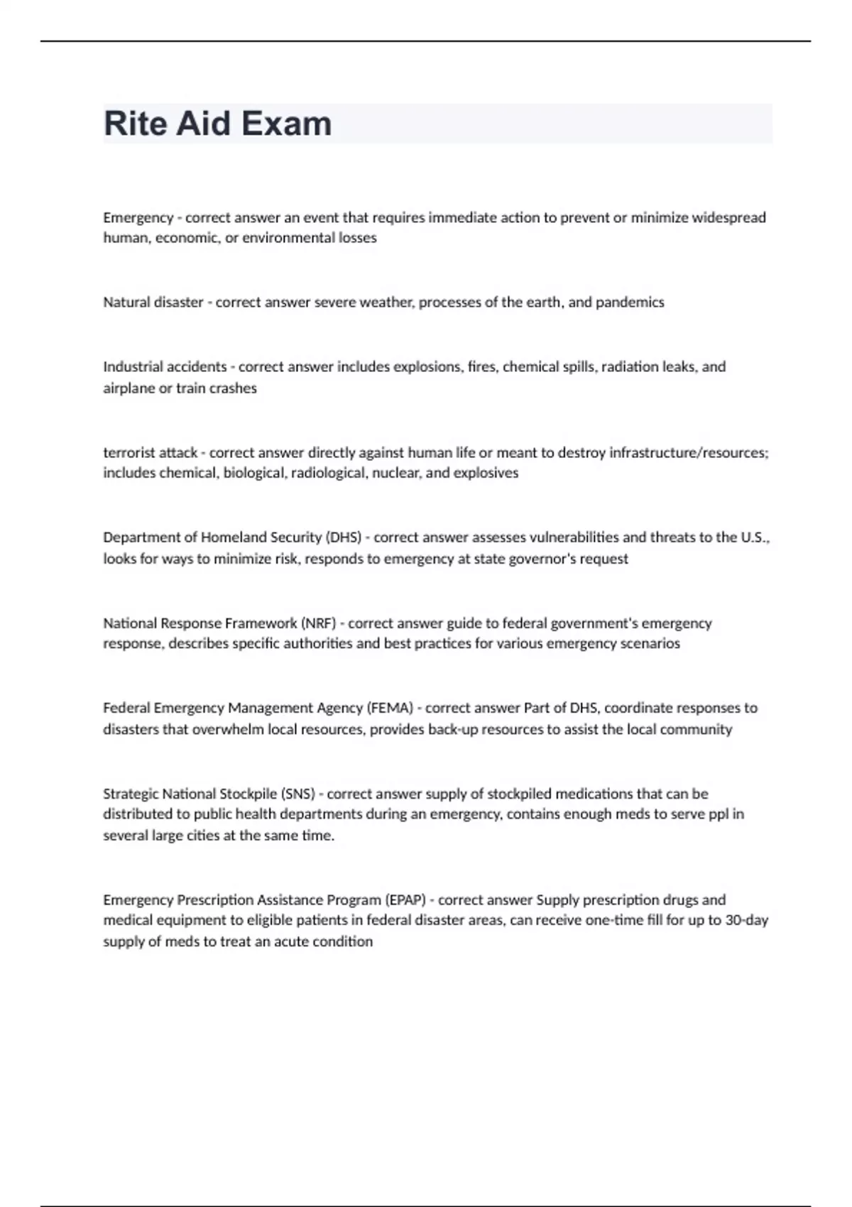 Rite Aid ExamEmergency - correct answer an event that requires immediate action to prevent or minimize widespread human, economic, or environmental losses Natural disaster - correct answer severe weather, processes of the earth, and pandemics Industrial accidents - correct answer includes explosions, fires, chemical spills, radiation leaks, and airplane or train crashes terrorist attack - correct answer directly against human life or meant to destroy infrastructure/resources; includes chemical, biological, radiological, nuclear, and explosives Department of Homeland Security (DHS) - correct answer assesses vulnerabilities and threats to the U.S., looks for ways to minimize risk, responds to emergency at state governor's request National Response Framework (NRF) - correct answer guide to federal government's emergency response, describes specific authorities and best practices for various emergency scenarios Federal Emergency Management Agency (FEMA) - correct answer Part of DHS, coordinate responses to disasters that overwhelm local resources, provides back-up resources to assist the local community Strategic National Stockpile (SNS) - correct answer supply of stockpiled medications that can be distributed to public health departments during an emergency, contains enough meds to serve ppl in several large cities at the same time. Emergency Prescription Assistance Program (EPAP) - correct answer Supply prescription drugs and medical equipment to eligible patients in federal disaster areas, can receive one-time fill for up to 30-day supply of meds to treat an acute condition