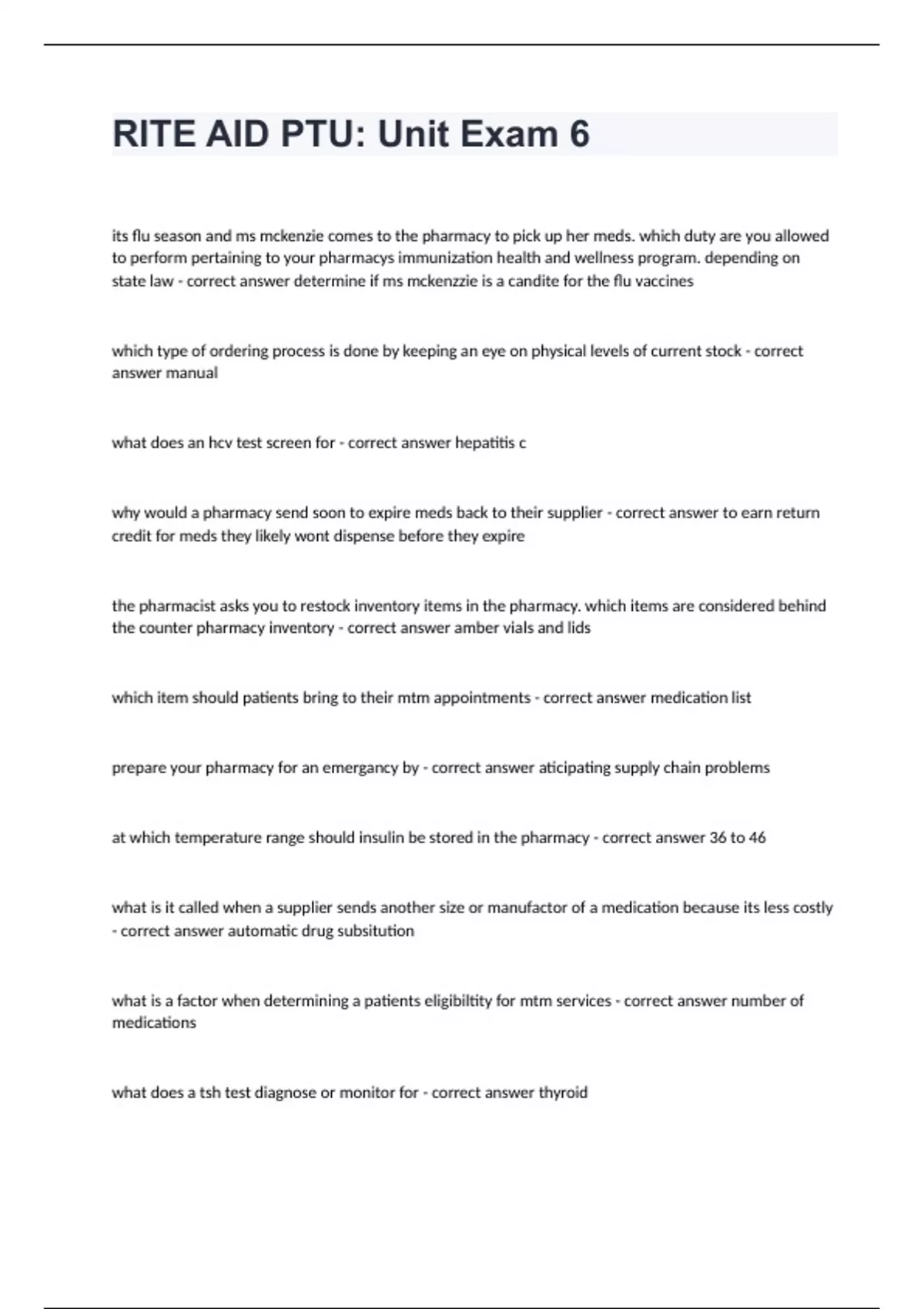 RITE AID PTU: Unit Exam 6its flu season and ms mckenzie comes to the pharmacy to pick up her meds. which duty are you allowed to perform pertaining to your pharmacys immunization health and wellness program. depending on state law - correct answer determine if ms mckenzzie is a candite for the flu vaccines which type of ordering process is done by keeping an eye on physical levels of current stock - correct answer manual what does an hcv test screen for - correct answer hepatitis c why would a pharmacy send soon to expire meds back to their supplier - correct answer to earn return credit for meds they likely wont dispense before they expire the pharmacist asks you to restock inventory items in the pharmacy. which items are considered behind the counter pharmacy inventory - correct answer amber vials and lids which item should patients bring to their mtm appointments - correct answer medication list prepare your pharmacy for an emergancy by - correct answer aticipating supply chain problems at which temperature range should insulin be stored in the pharmacy - correct answer 36 to 46 what is it called when a supplier sends another size or manufactor of a medication because its less costly - correct answer automatic drug subsitution what is a factor when determining a patients eligibiltity for mtm services - correct answer number of medications what does a tsh test diagnose or monitor for - correct answer thyroid