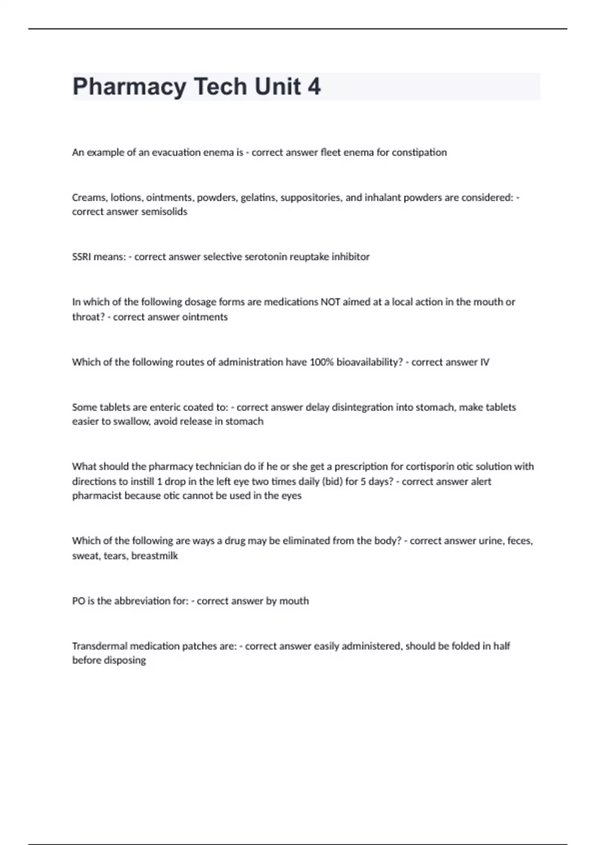 Pharmacy Tech Unit 4 An example of an evacuation enema is - correct answer fleet enema for constipation Creams, lotions, ointments, powders, gelatins, suppositories, and inhalant powders are considered: - correct answer semisolids SSRI means: - correct answer selective serotonin reuptake inhibitor In which of the following dosage forms are medications NOT aimed at a local action in the mouth or throat? - correct answer ointments Which of the following routes of administration have 100% bioavailability? - correct answer IV Some tablets are enteric coated to: - correct answer delay disintegration into stomach, make tablets easier to swallow, avoid release in stomach What should the pharmacy technician do if he or she get a prescription for cortisporin otic solution with directions to instill 1 drop in the left eye two times daily (bid) for 5 days? - correct answer alert pharmacist because otic cannot be used in the eyes Which of the following are ways a drug may be eliminated from the body? - correct answer urine, feces, sweat, tears, breastmilk PO is the abbreviation for: - correct answer by mouth Transdermal medication patches are: - correct answer easily administered, should be folded in half before disposing What can be added to a mixture of water and oil to bind them together in a medication base? - correct answer Emulsifier Suspensions: - correct answer must always be shaken, are a good choice for children and seniors, have small solid particles suspended in a base Rectal suppositories act __ when they are used for nausea and vomiting. - correct answer systematically Syrups contain water and __ with dissolved medications. - correct answer sugar MDI stands for: - correct answer Metered Dose Inhaler What is the primary site of drug metabolism in the human body? - correct answer the liver Which of the following is the abbreviation for ointment? - correct answer ung Which topical preparation is designed to absorb secretions? - correct answer pastes The "Do Not Use List" provided by The Joint Commission (TJC) outlines: - correct answer Medication abbreviations that physicians are not permitted to use. The location of a medication throughout blood, organs, and tissues is called: - correct answer distribution Interpreting medical terms involves learning the meanings of: - correct answer prefixes, suffixes, root words ADME stands for: - correct answer absorption, distribution, metabolism, excretion