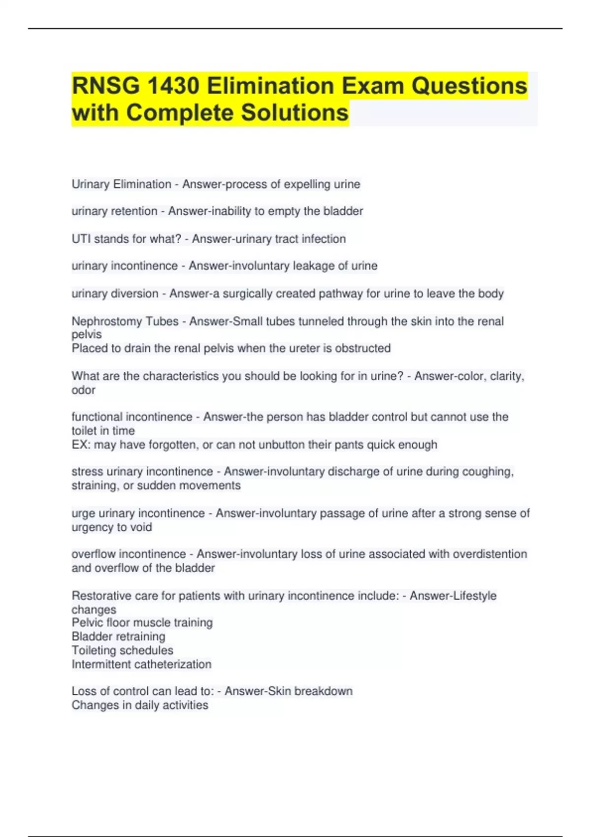 RNSG 1430 Elimination Exam Questions with Complete Solutions Urinary Elimination - Answer-process of expelling urine urinary retention - Answer-inability to empty the bladder UTI stands for what? - Answer-urinary tract infection urinary incontinence - Answer-involuntary leakage of urine urinary diversion - Answer-a surgically created pathway for urine to leave the body Nephrostomy Tubes - Answer-Small tubes tunneled through the skin into the renal pelvis Placed to drain the renal pelvis when the ureter is obstructed What are the characteristics you should be looking for in urine? - Answer-color, clarity, odor functional incontinence - Answer-the person has bladder control but cannot use the toilet in time EX: may have forgotten, or can not unbutton their pants quick enough stress urinary incontinence - Answer-involuntary discharge of urine during coughing, straining, or sudden movements urge urinary incontinence - Answer-involuntary passage of urine after a strong sense of urgency to void overflow incontinence - Answer-involuntary loss of urine associated with overdistention and overflow of the bladder Restorative care for patients with urinary incontinence include: - Answer-Lifestyle changes Pelvic floor muscle training Bladder retraining Toileting schedules Intermittent catheterization Loss of control can lead to: - Answer-Skin breakdown Changes in daily activities Changes in social relationships Reasons for incontinence include: - Answer-Stress Urge Overactive Bladder Functional Overflow Mixed Transient Urinary Retention can lead to... - Answer-increased urine volume and bladder distention Backflow to the upper urinary tract Dilation of the ureters and renal pelvis Pyelonephritis and renal atrophy True or False: Ignoring the "urge to go" can lead to bowel retention - Answer-True Bowel retention can lead to... - Answer-Stool dries and hardens Constipation Impaction