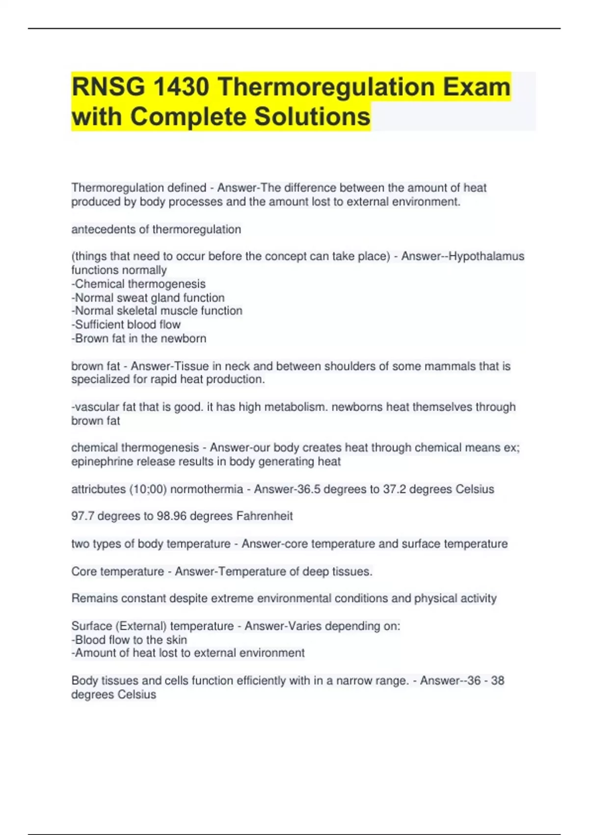 RNSG 1430 Thermoregulation Exam with Complete Solutions Thermoregulation defined - Answer-The difference between the amount of heat produced by body processes and the amount lost to external environment. antecedents of thermoregulation (things that need to occur before the concept can take place) - Answer--Hypothalamus functions normally -Chemical thermogenesis -Normal sweat gland function -Normal skeletal muscle function -Sufficient blood flow -Brown fat in the newborn brown fat - Answer-Tissue in neck and between shoulders of some mammals that is specialized for rapid heat production. -vascular fat that is good. it has high metabolism. newborns heat themselves through brown fat chemical thermogenesis - Answer-our body creates heat through chemical means ex; epinephrine release results in body generating heat attricbutes (10;00) normothermia - Answer-36.5 degrees to 37.2 degrees Celsius 97.7 degrees to 98.96 degrees Fahrenheit two types of body temperature - Answer-core temperature and surface temperature Core temperature - Answer-Temperature of deep tissues. Remains constant despite extreme environmental conditions and physical activity Surface (External) temperature - Answer-Varies depending on: -Blood flow to the skin -Amount of heat lost to external environment Body tissues and cells function efficiently with in a narrow range. - Answer--36 - 38 degrees Celsius -96.8 - 100.4 degrees Fahrenheit Body Temperature Regulation occurs through - Answer-Neural and Vascular Control Heat Production Heat Loss Skin Behavioral Control Mechanisms of heat loss - Answer-Sweating Vasodilation (widening of blood vessels) Inhibition of heat production Role of hypothalamus in regulating and maintaining the body's temperature - Answer-- Hypothalamus controls body temp like a thermostat -Mechanisms of heat loss -Mechanisms of heat conservation Mechanisms of heat conservation - Answer--Vasoconstriction (narrowing of blood vessels) -Voluntary muscle contraction -Muscle shivering Hypothalamus controls body temp like a thermostat - Answer--Anterior hypothalamus controls heat loss (AC) -Posterior hypothalamus controls heat production (heater) what is the primary fuel source of metabolism - Answer-food If metabolism increases - Answer-heat is produced. if metabolism decreases - Answer-less heat is produced heat production definition/occurence - Answer--Is a by-product of metabolism -Occurs during rest, voluntary movements, involuntary shivering, and in non-shivering thermogenesis