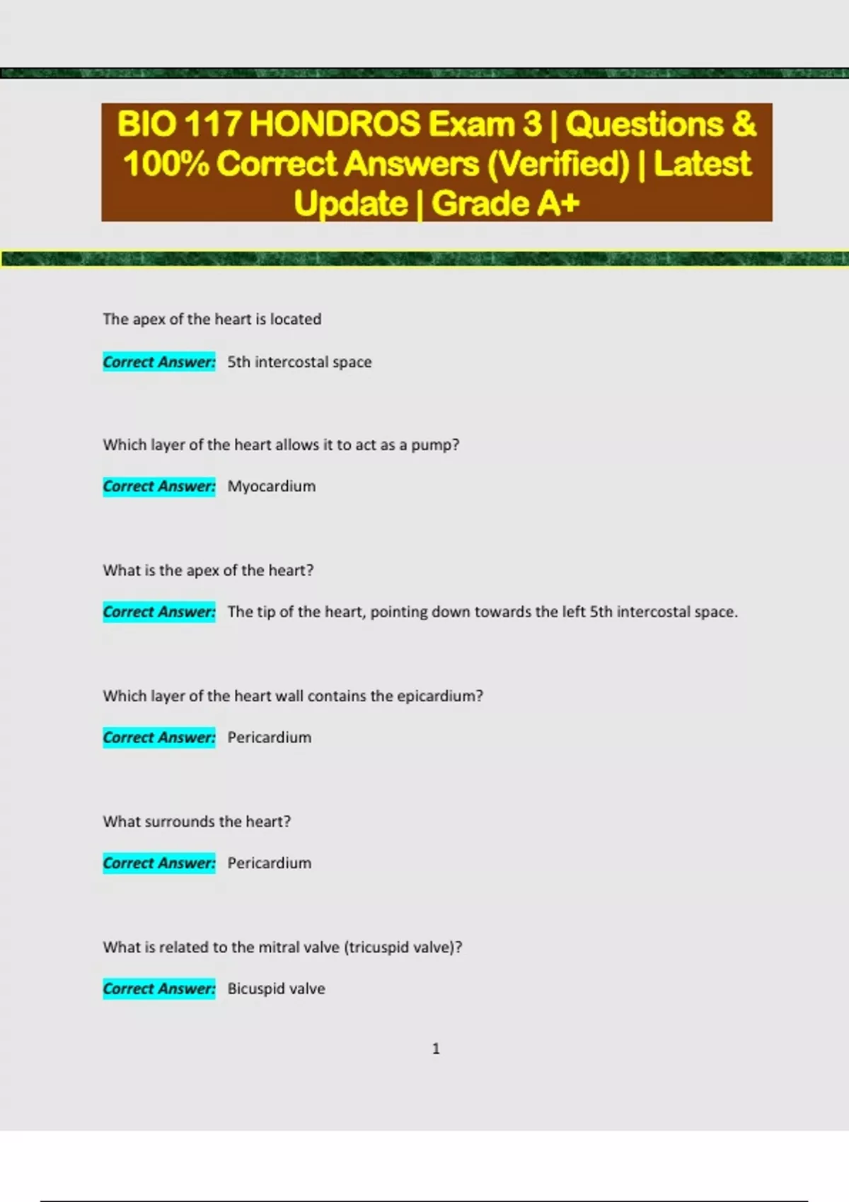 BIO 117 HONDROS Exam 3 | Questions & 100% Correct Answers (Verified) | Latest Update | Grade A+ The apex of the heart is located Correct Answer: 5th intercostal space Which layer of the heart allows it to act as a pump? Correct Answer: Myocardium What is the apex of the heart? Correct Answer: The tip of the heart, pointing down towards the left 5th intercostal space. Which layer of the heart wall contains the epicardium? Correct Answer: Pericardium What surrounds the heart? Correct Answer: Pericardium What is related to the mitral valve (tricuspid valve)? Correct Answer: Bicuspid valve 2 Which of the following contains oxygenated blood? Correct Answer: Left Atrium, Pulmonary veins, Aorta Which of the following contains deoxygenated blood? Correct Answer: Superior Vena Cava, Right Atrium, Pulmonary Arteries What supplies oxygenated blood to the heart muscle? Correct Answer: Coronary Arteries Which layer of the heart contains actin, myosin, and troponin? Correct Answer: Myocardium Which valves are open during atrial systole? Correct Answer: Tricuspid Mitral What is true of blood leaving the tissues and traveling towards the right atrium? Correct Answer: Oxygen poor, carbon dioxide rich Valve that prevents backflow of blood into the left ventricle when the left ventricle is in diastole? Correct Answer: Aorti