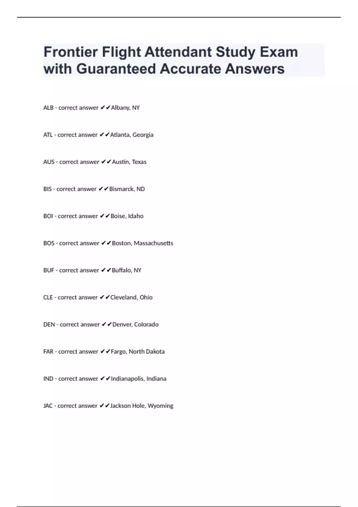 ALB - correct answer Albany, NY ATL - correct answer Atlanta, Georgia AUS - correct answer Austin, Texas BIS - correct answer Bismarck, ND BOI - correct answer Boise, Idaho BOS - correct answer Boston, Massachusetts BUF - correct answer Buffalo, NY CLE - correct answer Cleveland, Ohio DEN - correct answer Denver, Colorado FAR - correct answer Fargo, North Dakota IND - correct answer Indianapolis, Indiana JAC - correct answer Jackson Hole, Wyoming TUL - correct answer Tulsa, Oklahoma LAR - correct answer Laramie, Wyoming LAS - correct answer Las Vegas, NV