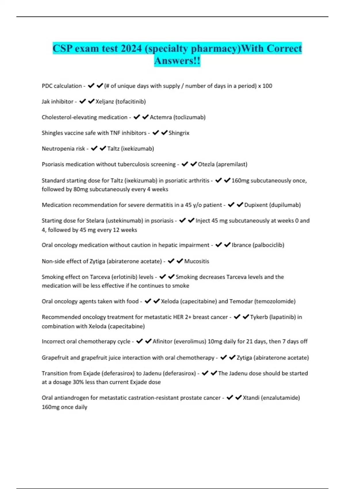 CSP EXAM TEST SPECIALTY PHARMACY ACTUAL 2025/2026 QUESTIONS AND 100% CORRECT ANSWERS PDC calculation - Answer -(# of unique days with supply / number of days in a period) x 100 Jak inhibitor - Answer -Xeljanz (tofacitinib) Cholesterol-elevating medication - Answer -Actemra (toclizumab) Shingles vaccine safe with TNF inhibitors - Answer -Shingrix Neutropenia risk - Answer -Taltz (ixe