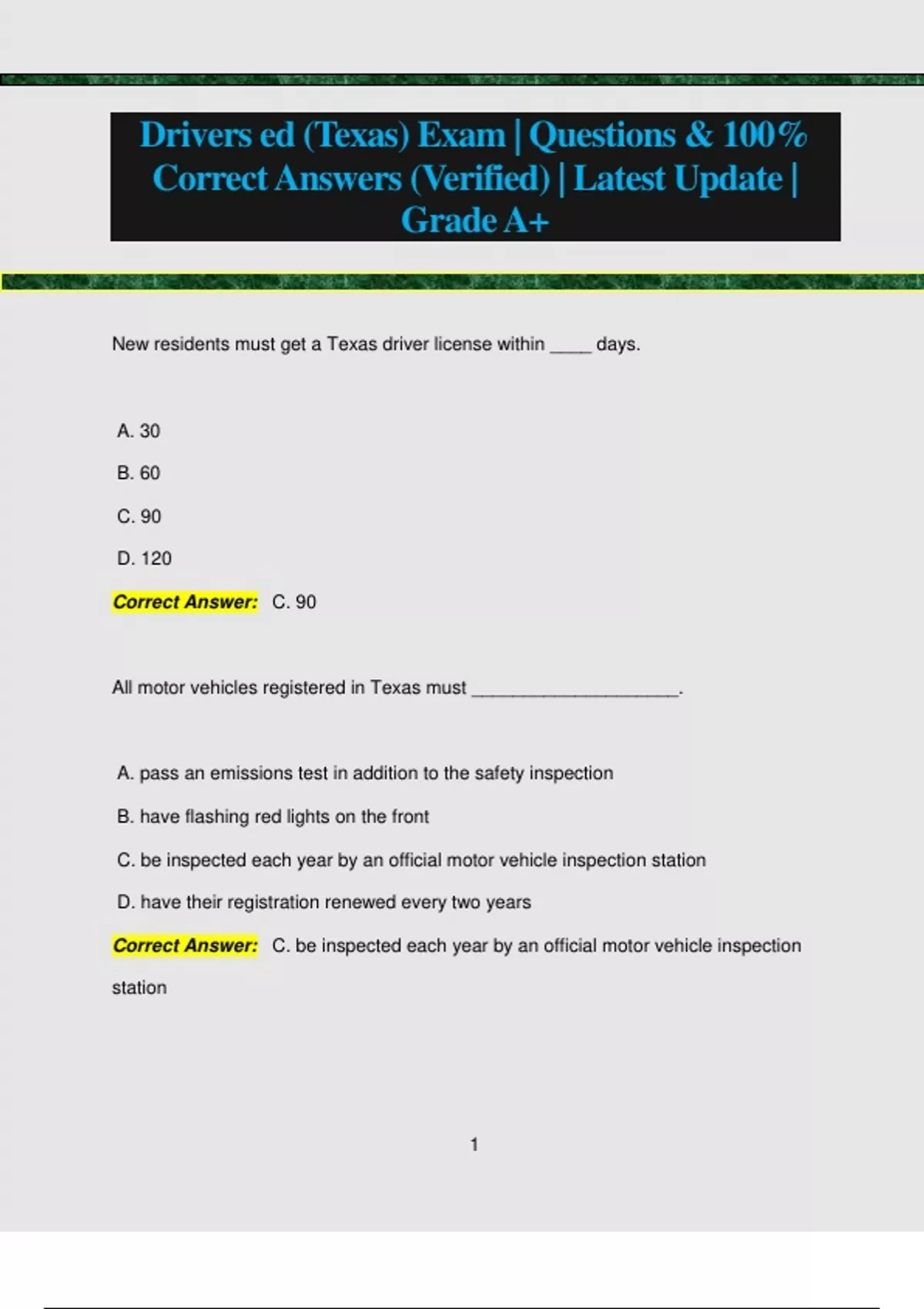 Drivers ed (Texas) Exam | Questions & 100% Correct Answers (Verified) | Latest Update | GradeA+ New residents must get a Texas driver license within ____ days. A. 30 B. 60 C. 90 D. 120 Correct Answer: C. 90 All motor vehicles registered in Texas must ____________________. A. pass an emissions test in addition to the safety inspection B. have flashing red lights on the front C. be inspected each year by an official motor vehicle inspection station D. have their registration renewed every two years Correct Answer: C. be inspected each year by an official motor vehicle inspection station 2 If you illegally drive without a drivers license you may be fined up to $______ for your first conviction. A. 200 B. 600 C. 1,000 D. 5,000 Correct Answer: A. 200 Driving is a ___________. A. Constitutional right B. human right C. game D. privilege Correct Answer: D. Privilege Your driving privilege will be automatically suspended if convicted for _____________ offense(s). A. Intoxication manslaughter B. Evading arrest C. Lending your drivers license to someone els
