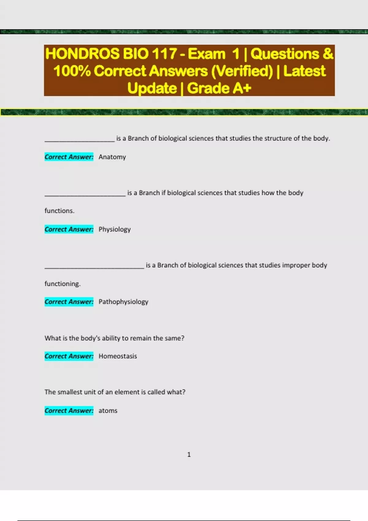 HONDROS BIO 117 - Exam 1 | Questions & 100% Correct Answers (Verified) | Latest Update | Grade A+ ___________________ is a Branch of biological sciences that studies the structure of the body. Correct Answer: Anatomy ______________________ is a Branch if biological sciences that studies how the body functions. Correct Answer: Physiology ___________________________ is a Branch of biological sciences that studies improper body functioning. Correct Answer: Pathophysiology What is the body's ability to remain the same? Correct Answer: Homeostasis The smallest unit of an element is called what? Correct Answer: atoms 2 What is it called when two or more atoms bond? Correct Answer: Molecules ________________ can be found in the bones, nerves, skin, muscles, etc. Correct Answer: Cells _________________ can be muscle, connective, and epithelial. Correct Answer: Tissues The heart, stomach, and kidneys are an example of what? Correct Answer: Organs Digestion, excretion, and reproduction are an example of what? Correct Answer: An organ system A human is an example of what? Correct Answer: Organism ____________________ feedback is one way our bodies regulate homeostasis. Correct Answer: Negative feedback When the body is in anatomical position, the body is erect and facing which way? 3 Correct Answer: Forward When the body is in anatomical position, the palms are facing which direction? Correct Answer: Forward Directional Terminology: Front Correct Answer: Anterior Directional Terminology: Back Correct Answer: Posterior Directional Terminology: Above Correct Answer: Superior Directional Terminology: Below Correct Answer: In