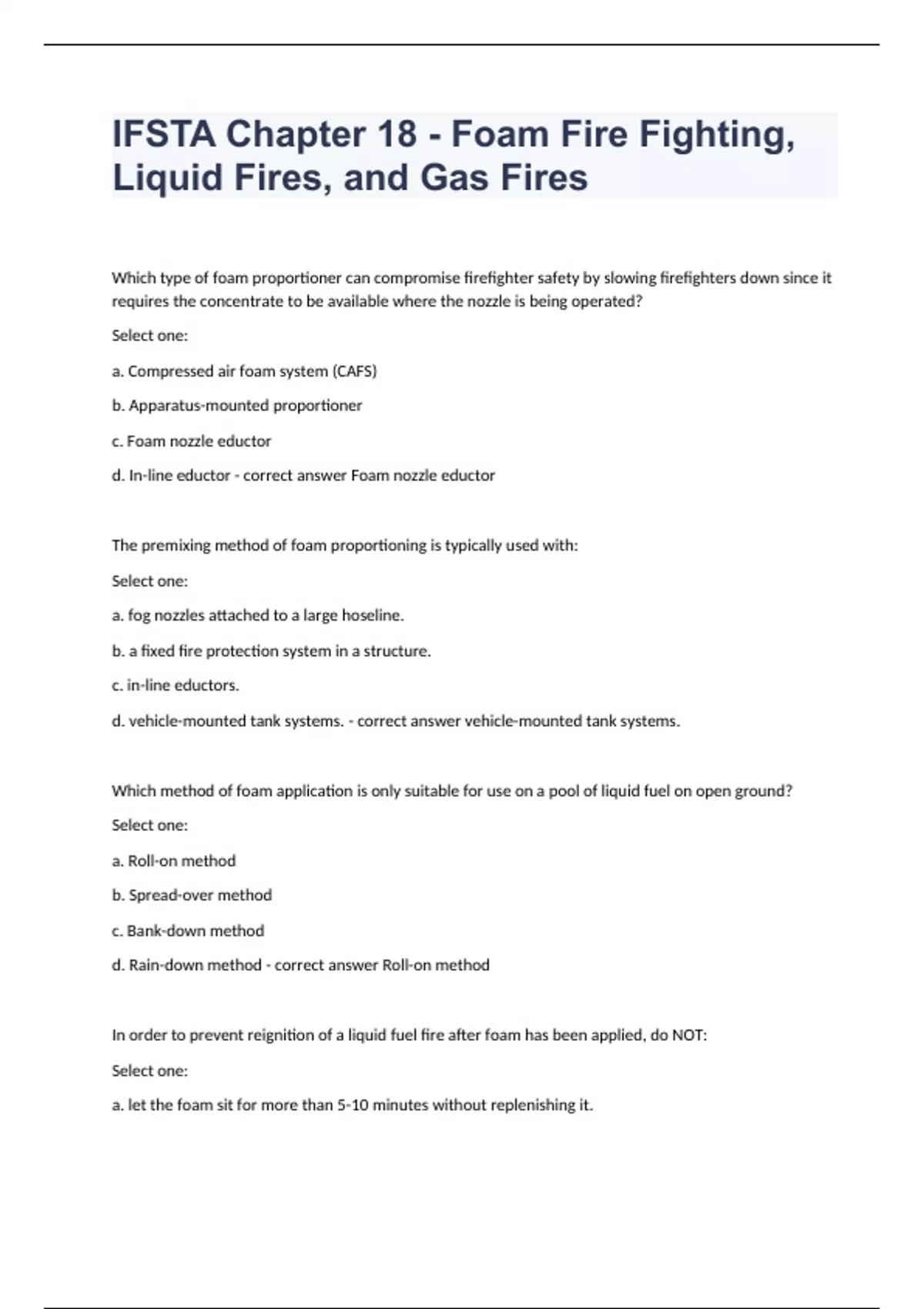 IFSTA Chapter 18 - Foam Fire Fighting, Liquid Fires, and Gas Fires Complete Study Guide 2024. Which type of foam proportioner can compromise firefighter safety by slowing firefighters down since it requires the concentrate to be available where the nozzle is being operated? Select one: a. Compressed air foam system (CAFS) b. Apparatus-mounted proportioner c. Foam nozzle eductor d. In-line eductor - correct answer Foam nozzle eductor The premixing method of foam proportioning is typically used with: Select one: a. fog nozzles attached to a large hoseline. b. a fixed fire protection system in a structure. c. in-line eductors. d. vehicle-mounted tank systems. - correct answer vehicle-mounted tank systems. Which method of foam application is only suitable for use on a pool of liquid fuel on open ground? Select one: a. Roll-on method b. Spread-over method c. Bank-down method d. Rain-down method - correct answer Roll-on method In order to prevent reignition of a liquid fuel fire after foam has been applied, do NOT: Select one: a. let the foam sit for more than 5-10 minutes without replenishing it. b. apply a solid or straight stream of water to the foam blanket. c. add any more foam after the surface has been covered once. d. apply more foam than necessary for extinguishment. - correct answer apply a solid or straight stream of water to the foam blanket. Most fire fighting foams are intended to be mixed with: Select one: a. 50 to 75.9 percent water. b. 80 to 90 percent water. c. 30 to 60 percent water. d. 94 to 99.9 percent water. - correct answer 94 to 99.9 percent water.
