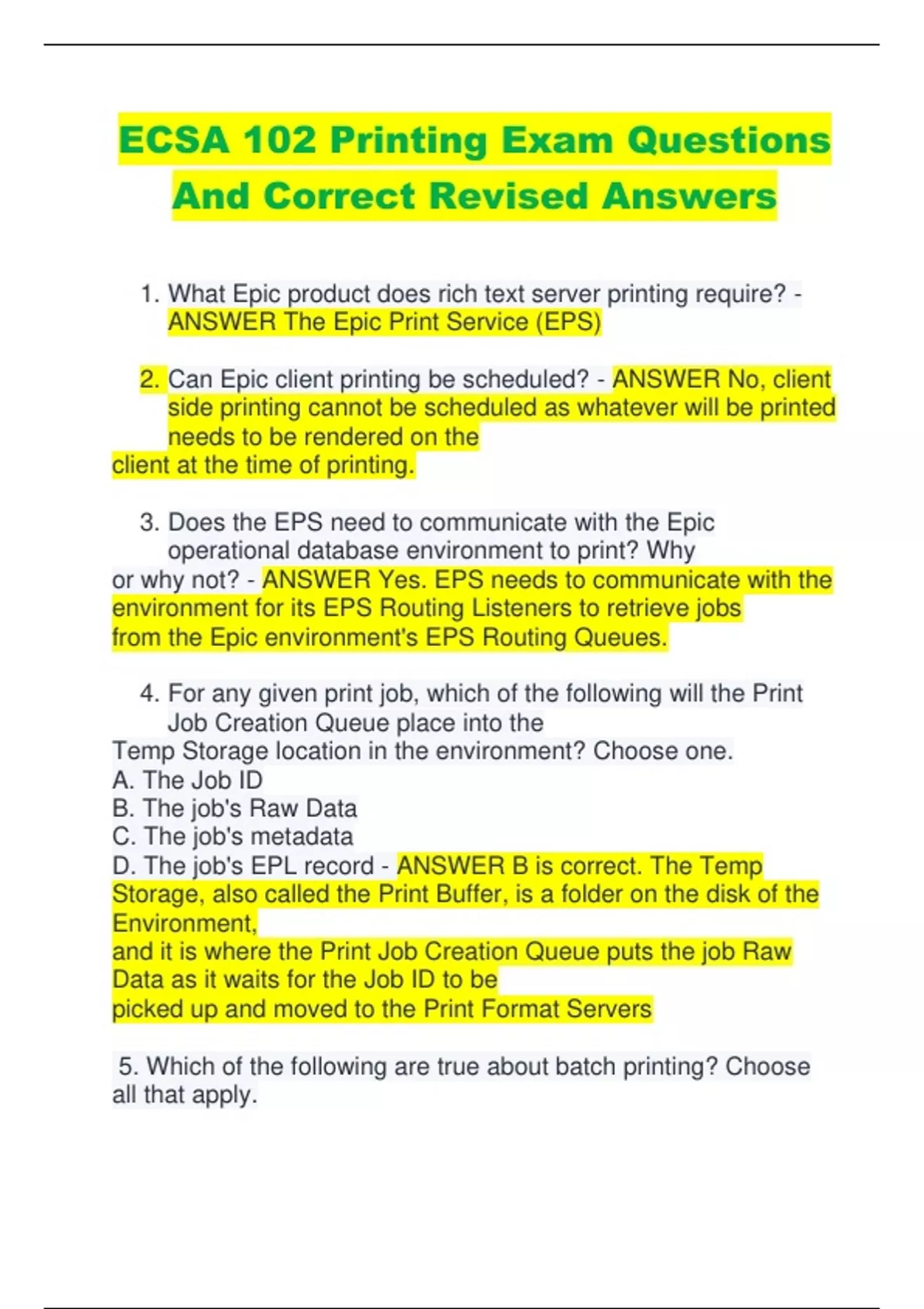 ECSA 102 BCA Epic Test Question And Revised Correct Answers 1. Application analysts, working with their Epic counterparts, create and schedule reports in the ____________________ operational database environment - ANSWER : production 2. Application analysts, working with their Epic counterparts, create and schedule reports in the production operational database environment. The build is then replicated to the ______________ operational database environment. - ANSWER : reporting 3. When a report is scheduled to run it is created by the ________________ environment. - ANSWER : reporting 4. When a report is scheduled to run it is created by the reporting environment. The build references an EPR which calls , which is a symbolic link to __________. - ANSWER : 5. __________ is referenced by to know where and how to transfer the report. - ANSWER :