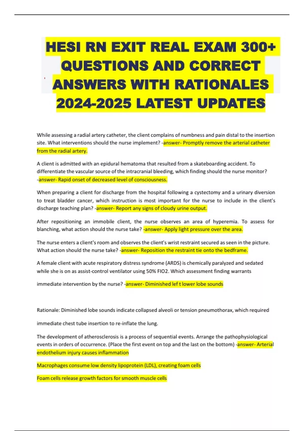 HESI RN EXIT REAL EXAM 300+ QUESTIONS AND CORRECT ANSWERS WITH RATIONALES LATEST UPDATES While assessing a radial artery catheter, the client complains of numbness and pain distal to the insertion site. What interventions should the nurse implement? -answer- Promptly remove the arterial catheter from the radial artery. A client is admitted with an epidural hematoma that resulted from a skateboarding accident. To differentiate the vascularsource of the intracranial bleeding, which finding should the nurse monitor? -answer- Rapid onset of decreased level of consciousness. When preparing a client for discharge from the hospital following a cystectomy and a urinary diversion to treat bladder cancer, which instruction is most important for the nurse to include in the client's discharge teaching plan? -answer- Report any signs of cloudy urine output. After repositioning an immobile client, the nurse observes an area of hyperemia. To assess for blanching, what action should the nurse take? -answer- Apply light pressure over the area. The nurse enters a client's room and observes the client's wrist restraint secured as seen in the picture. What action should the nurse take? -answer- Reposition the restraint tie onto the bedframe. A female client with acute respiratory distress syndrome (ARDS) is chemically paralyzed and sedated while she is on as assist-control ventilator using 50% FIO2. Which assessment finding warrants immediate intervention by the nurse? -answer- Diminished lef t lower lobe sounds Rationale: Diminished lobe sounds indicate collapsed alveoli or tension pneumothorax, which required immediate chest tube insertion to re-inflate the lung. The development of atherosclerosis is a process of sequential events. Arrange the pathophysiological events in orders of occurrence. (Place the first event on top and the last on the bottom) -answer- Arterial endothelium injury causes inflammation Macrophages consume low density lipoprotein (LDL), creating foam cells Foam cellsrelease growth factors forsmooth muscle cells HESI RN EXIT REAL EXAM 300+ QUESTIONS AND CORRECT ANSWERS WITH RATIONALES LATEST UPDATES Smooth muscle grows over fatty streaks creating fibrous plaques Vessel narrowing results in ischemia Following a motor vehicle collision, an adult female with a ruptured spleen and a blood pressure of 70/44, had an emergency splenectomy. Twelve hours after the surgery, her urine output is 25 ml/hour for the last two hours. What pathophysiological reason supports the nurse's decision to report this finding to the healthcare provider? -answer- Oliguria signalstubular necrosis related to hypoperfusion A nurse-manager is preparing the curricula for a classfor charge nurses. A staffing formula based on what data ensures quality client care and is most cost-effective? -answer- Skills of staff and client acuity When performing postural drainage on a client with Chronic Obstructive Pulmonary Disease (COPD), which approach should the nurse use? -answer- Explain that the client may be placed in five positions A client presents in the emergency room with right-sided facial asymmetry. The nurse asks the client to perform a series of movements that require use of the facial muscles. What symptoms suggest that the client has most likely experience a Bell's palsy rather than a stroke? -answer- Inability to close the affected eye, raise brow, or smile The nurse is teaching a client how to perform colostomy irrigations. When observing the client'sreturn demonstration, which action indicated that the client understood the teaching? -answer- Keeps the irrigating container less than 18 inches above the stoma