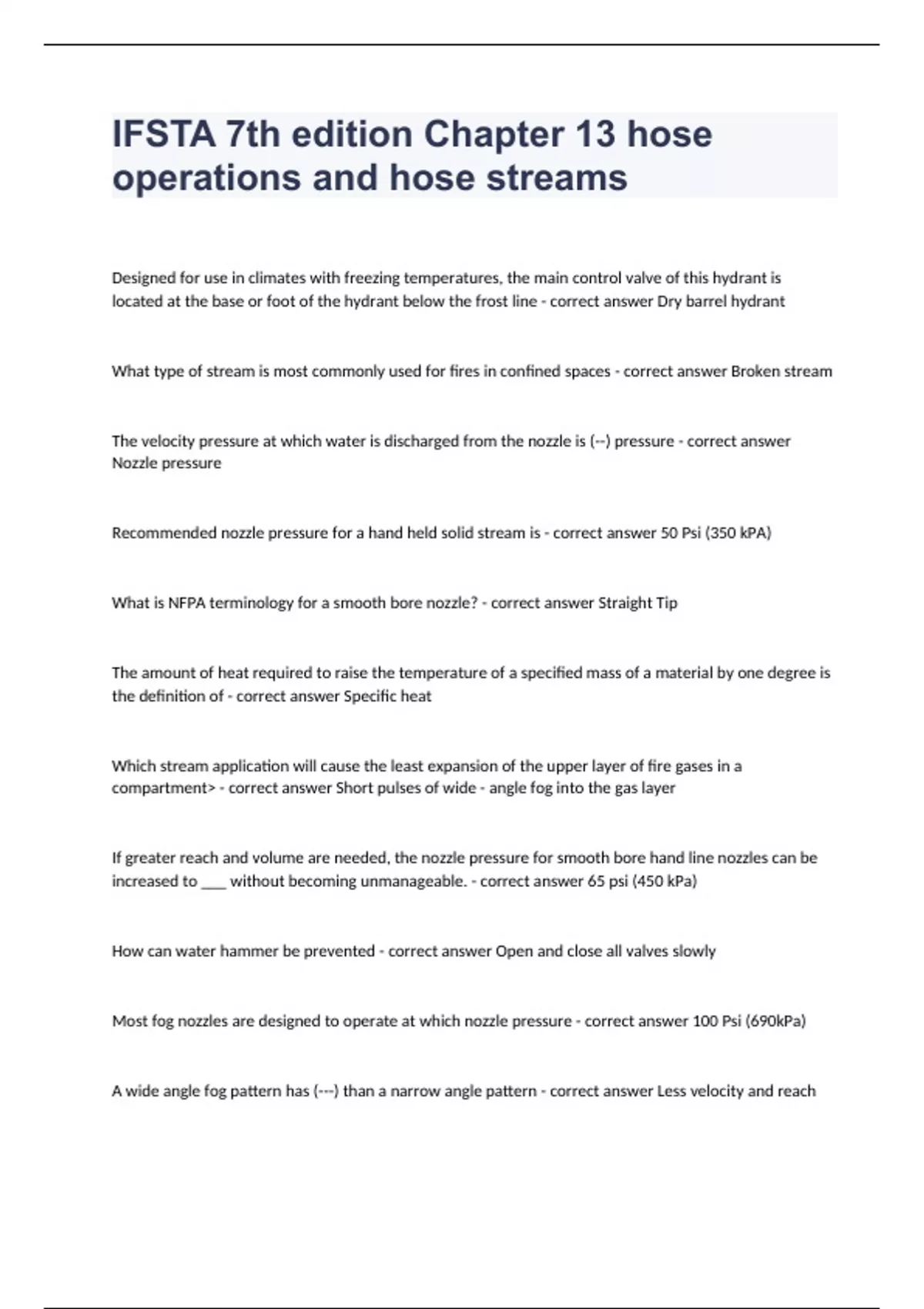 IFSTA 7th Edition Chapter 13 Hose Operations And Hose Streams Practice Questions 2024. Designed for use in climates with freezing temperatures, the main control valve of this hydrant is located at the base or foot of the hydrant below the frost line - correct answer Dry barrel hydrant What type of stream is most commonly used for fires in confined spaces - correct answer Broken stream The velocity pressure at which water is discharged from the nozzle is (--) pressure - correct answer Nozzle pressure Recommended nozzle pressure for a hand held solid stream is - correct answer 50 Psi (350 kPA) What is NFPA terminology for a smooth bore nozzle? - correct answer Straight Tip The amount of heat required to raise the temperature of a specified mass of a material by one degree is the definition of - correct answer Specific heat Which stream application will cause the least expansion of the upper layer of fire gases in a compartment - correct answer Short pulses of wide - angle fog into the gas layer If greater reach and volume are needed, the nozzle pressure for smooth bore hand line nozzles can be increased to ___ without becoming unmanageable. - correct answer 65 psi (450 kPa) How can water hammer be prevented - correct answer Open and close all valves slowly Most fog nozzles are designed to operate at which nozzle pressure - correct answer 100 Psi (690kPa) A wide angle fog pattern has (---) than a narrow angle pattern - correct answer Less velocity and reach Compared to the other stream types, solid streams are - correct answer Absorb less heat per gallon discharged Past the point of break over, water from a solid stream becomes - correct answer showers of spray What is NFPA terminology for a fog nozzle? A. Mist B. Spray C. Broken D. Fog - correct