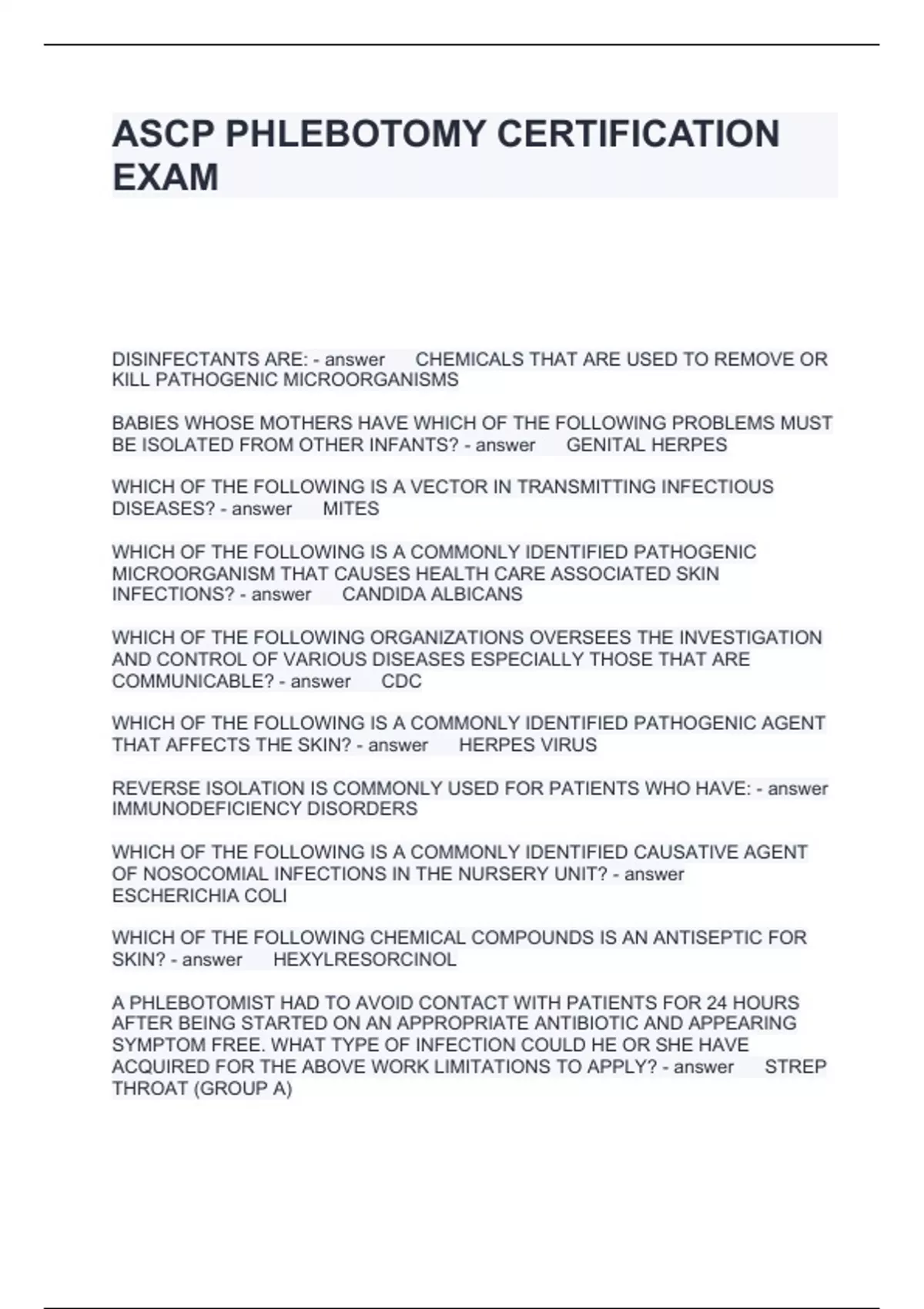 ASCP PHLEBOTOMY CERTIFICATION EXAM QUESTIONS AND ANSWERS FULLY SOLVED