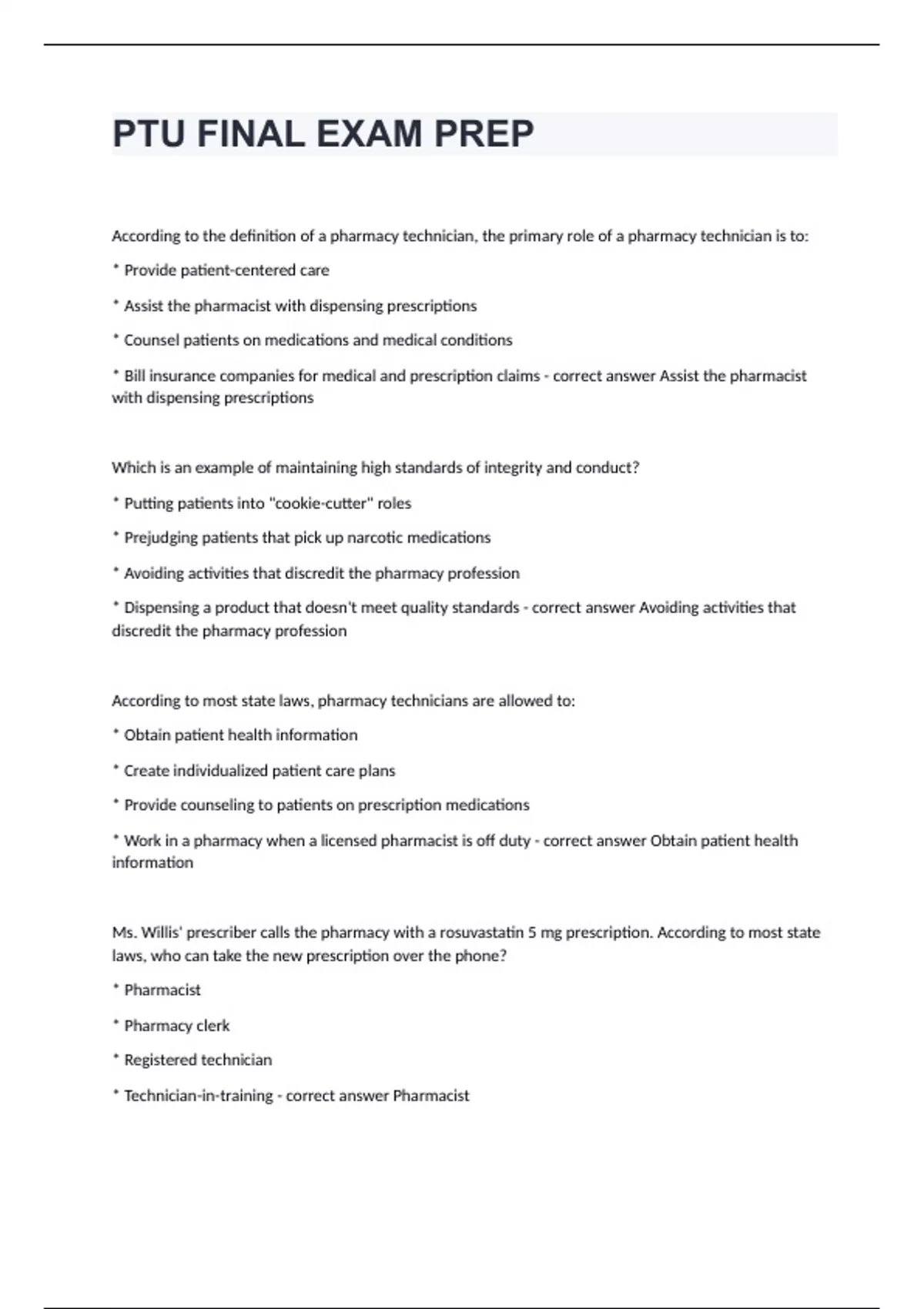 PTU FINAL EXAM PREPAccording to the definition of a pharmacy technician, the primary role of a pharmacy technician is to: * Provide patient-centered care * Assist the pharmacist with dispensing prescriptions * Counsel patients on medications and medical conditions * Bill insurance companies for medical and prescription claims - correct answer Assist the pharmacist with dispensing prescriptions Which is an example of maintaining high standards of integrity and conduct? * Putting patients into "cookie-cutter" roles * Prejudging patients that pick up narcotic medications * Avoiding activities that discredit the pharmacy profession * Dispensing a product that doesn't meet quality standards - correct answer Avoiding activities that discredit the pharmacy profession According to most state laws, pharmacy technicians are allowed to: * Obtain patient health information * Create individualized patient care plans * Provide counseling to patients on prescription medications * Work in a pharmacy when a licensed pharmacist is off duty - correct answer Obtain patient health information Ms. Willis' prescriber calls the pharmacy with a rosuvastatin 5 mg prescription. According to most state laws, who can take the new prescription over the phone? * Pharmacist * Pharmacy clerk * Registered technician * Technician-in-training - correct answer Pharmacist Cory, a community pharmacy technician, follows his pharmacy's protocols for keeping protected health information safe. This is an example of: * Minimizing stress * Respecting the patient Correct * Distributing quality medications * Improving workplace performance - correct answer Respecting the patient Which organization offers national pharmacy technician certification by exam? * DEA * FDA * NHA * PTA - correct answer NHA According to most state laws, a community pharmacy technician is allowed to: * Gather insurance information from a patient * Counsel patients on over-the-counter medications * Perform the final check of a completed prescription * Take a refill prescription with changes from a prescriber over the phone - correct answer Gather insurance information from a patient In which pharmacy setting is a technician most likely to maintain floor stock? * Community * Hospital * Long-term care * Mail-order - correct answer Hospital Pharmacists' Patient Care Process uses which type of approach in providing care? * Patient-centered * Pharmacist-centered