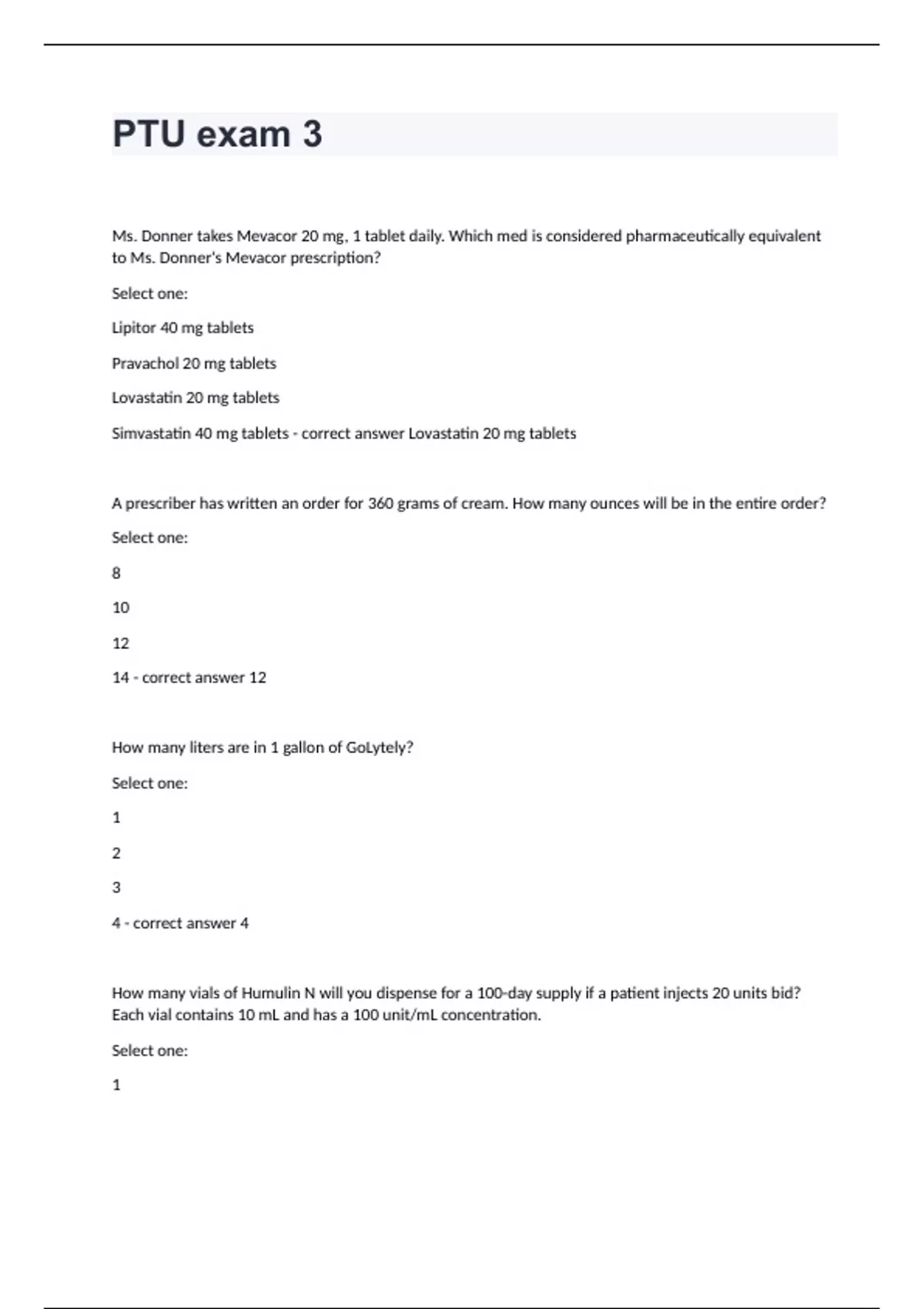 PTU exam 3 Ms. Donner takes Mevacor 20 mg, 1 tablet daily. Which med is considered pharmaceutically equivalent to Ms. Donner's Mevacor prescription? Select one: Lipitor 40 mg tablets Pravachol 20 mg tablets Lovastatin 20 mg tablets Simvastatin 40 mg tablets - correct answer Lovastatin 20 mg tablets A prescriber has written an order for 360 grams of cream. How many ounces will be in the entire order? Select one: 8 10 12 14 - correct answer 12 How many liters are in 1 gallon of GoLytely? Select one: 1 2 3 4 - correct answer 4 How many vials of Humulin N will you dispense for a 100-day supply if a patient injects 20 units bid? Each vial contains 10 mL and has a 100 unit/mL concentration. Select one: 1 2 3 4 - correct answer 4 A bottle of phenytoin 100 mg has an expiration date of September 2023. On which date does the medication expire? Select one: 8/30/2023 9/1/2023 9/30/2023 10/1/2023 - correct answer 9/30/2023 Which medication pair is an example of proper use of tall man lettering? Select one: ALPRAZolam/LORazepam aripiPRAZOLE/rabePRAZOLE AVINza/inVANZ buPROPion/buspirONE - correct answer ALPRAZolam/LORazepam When a patient is required to see a primary care physician in their network, the patient likely has which type of insurance? Select one: Coordination of benefits Workers' compensation Health maintenance organization Preferred provider organization - correct answer Health maintenance organization Belbuca has an NDC number of . What does "63481" identify? Select one: