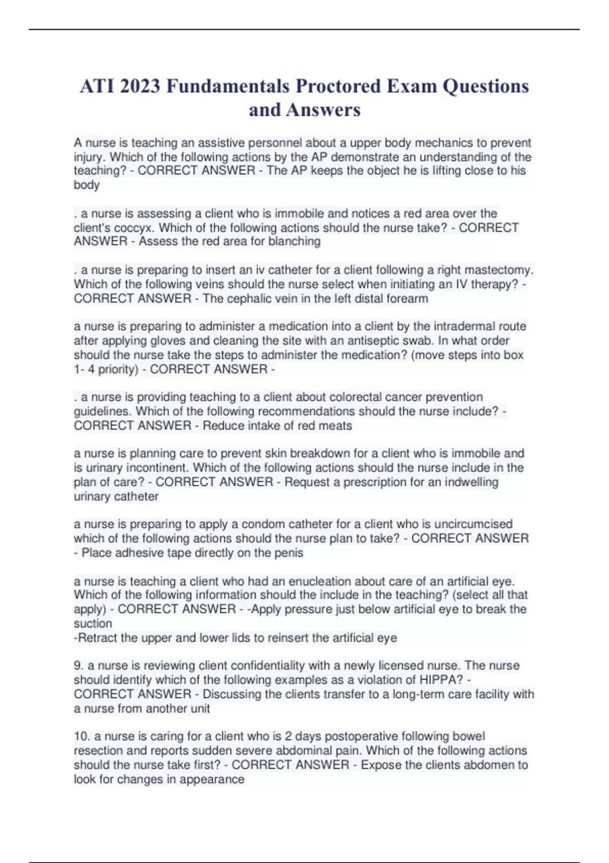 ATI 2023 Fundamentals Proctored Exam Questions and Answers A nurse is teaching an assistive personnel about a upper body mechanics to prevent injury. Which of the following actions by the AP demonstrate an understanding of the teaching? - CORRECT ANSWER - The AP keeps the object he is lifting close to his body . a nurse is assessing a client who is immobile and notices a red area over the client's coccyx. Which of the following actions should the nurse take? - CORRECT ANSWER - Assess the red area for blanching . a nurse is preparing to insert an iv catheter for a client following a right mastectomy. Which of the following veins should the nurse select when initiating an IV therapy? - CORRECT ANSWER - The cephalic vein in the left distal forearm a nurse is preparing to administer a medication into a client by the intradermal route after applying gloves and cleaning the site with an antiseptic swab. In what order should the nurse take the steps to administer the medication? (move steps into box 1- 4 priority) - CORRECT ANSWER - . a nurse is providing teaching to a client about colorectal cancer prevention guidelines. Which of the following recommendations should the nurse include? - CORRECT ANSWER - Reduce intake of red meats a nurse is planning care to prevent skin breakdown for a client who is immobile and is urinary incontinent. Which of the following actions should the nurse include in the plan of care? - CORRECT ANSWER - Request a prescription for an indwelling urinary catheter a nurse is preparing to apply a condom catheter for a client who is uncircumcised which of the following actions should the nurse plan to take? - CORRECT ANSWER - Place adhesive tape directly on the penis a nurse is teaching a client who had an enucleation about care of an artificial eye. Which of the following information should the include in the teaching? (select all that apply) - CORRECT ANSWER - -Apply pressure just below artificial eye to break the suction -Retract the upper and lower lids to reinsert the artificial eye 9. a nurse is reviewing client confidentiality with a newly licensed nurse. The nurse should identify which of the following examples as a violation of HIPPA? - CORRECT ANSWER - Discussing the clients transfer to a long-term care facility with a nurse from another unit 10. a nurse is caring for a client who is 2 days postoperative following bowel resection and reports sudden severe abdominal pain. Which of the following actions should the nurse take first? - CORRECT ANSWER - Expose the clients abdomen to look for changes in appearance