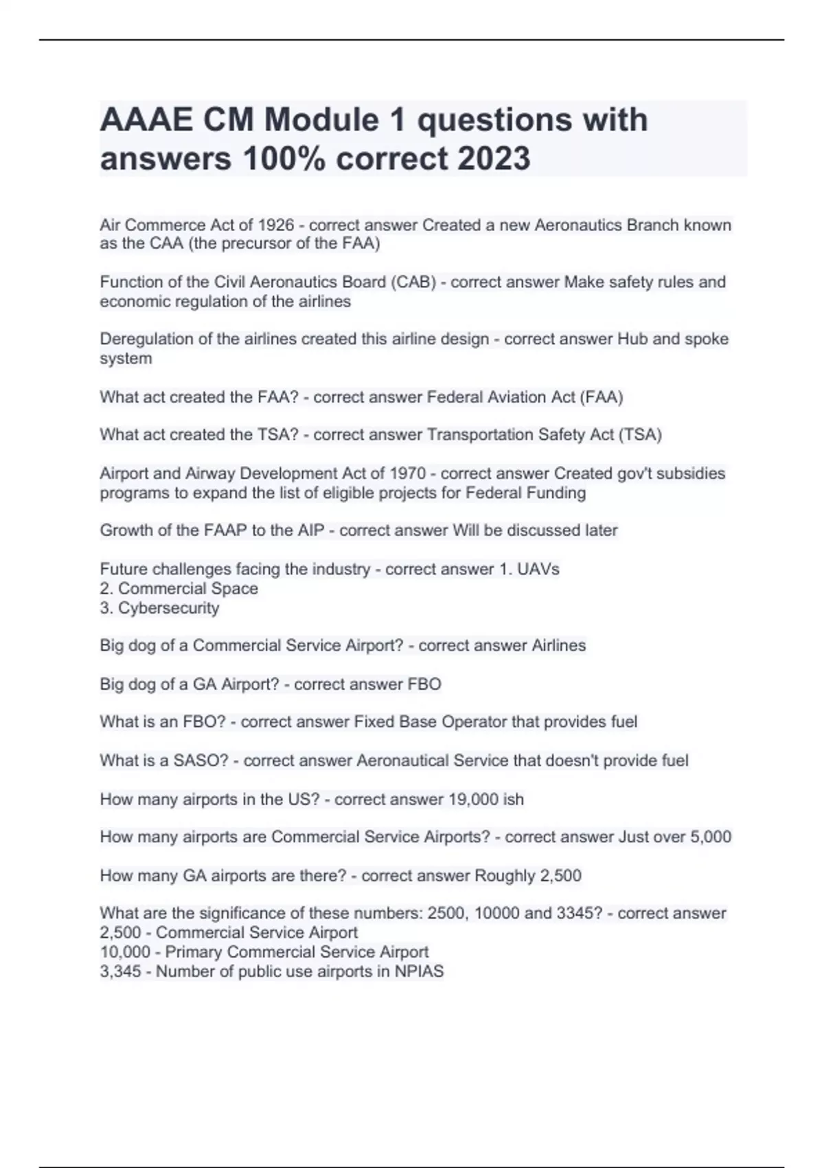 AAAE CM Module 1 Questions With Answers 100 % Updated Test 2024. Air Commerce Act of 1926 - correct answer Created a new Aeronautics Branch known as the CAA (the precursor of the FAA) Function of the Civil Aeronautics Board (CAB) - correct answer Make safety rules and economic regulation of the airlines Deregulation of the airlines created this airline design - correct answer Hub and spoke system What act created the FAA? - correct answer Federal Aviation Act (FAA) What act created the TSA? - correct answer Transportation Safety Act (TSA) Airport and Airway Development Act of 1970 - correct answer Created gov't subsidies programs to expand the list of eligible projects for Federal Funding Growth of the FAAP to the AIP - correct answer Will be discussed later Future challenges facing the industry - correct answer 1. UAVs 2. Commercial Space 3. Cybersecurity Big dog of a Commercial Service Airport? - correct answer Airlines Big dog of a GA Airport? - correct answer FBO What is an FBO? - correct answer Fixed Base Operator that provides fuel What is a SASO? - correct answer Aeronautical Service that doesn't provide fuel How many airports in the US? - correct answer 19,000 ish How many airports are Commercial Service Airports? - correct answer Just over 5,000 How many GA airports are there? - correct answer Roughly 2,500 What are the significance of these numbers: 2500, 10000 and 3345? - correct answer 2,500 - Commercial Service Airport 10,000 - Primary Commercial Service Airport 3,345 - Number of public use airports in NPIAS