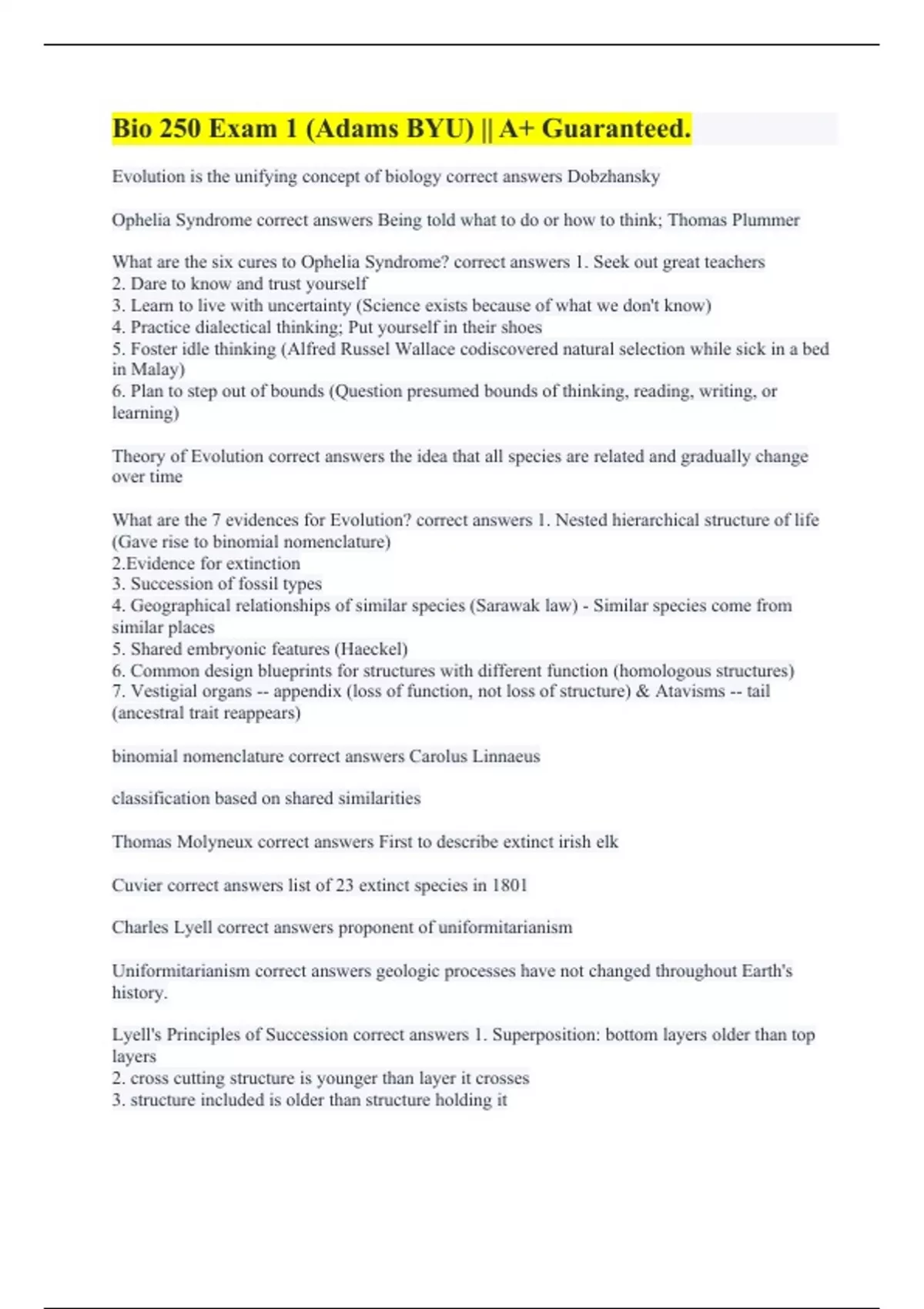Evolution is the unifying concept of biology correct answers Dobzhansky Ophelia Syndrome correct answers Being told what to do or how to think; Thomas Plummer What are the six cures to Ophelia Syndrome? correct answers 1. Seek out great teachers 2. Dare to know and trust yourself 3. Learn to live with uncertainty (Science exists because of what we don't know) 4. Practice dialectical thinking; Put yourself in their shoes 5. Foster idle thinking (Alfred Russel Wallace codiscovered natural selection while sick in a bed in Malay) 6. Plan to step out of bounds (Question presumed bounds of thinking, reading, writing, or learning) Theory of Evolution correct answers the idea that all species are related and gradually change over time What are the 7 evidences for Evolution? correct answers 1. Nested hierarchical structure of life (Gave rise to binomial nomenclature) 2.Evidence for extinction 3. Succession of fossil types 4. Geographical relationships of similar species (Sarawak law) - Similar species come from similar places 5. Shared embryonic features (Haeckel) 6. Common design blueprints for structures with different function (homologous structures) 7. Vestigial organs -- appendix (loss of function, not loss of structure) & Atavisms -- tail (ancestral trait reappears) binomial nomenclature correct answers Carolus Linnaeus classification based on shared similarities Thomas Molyneux correct answers First to describe extinct irish elk Cuvier correct answers list of 23 extinct species in 1801 Charles Lyell correct answers proponent of uniformitarianism Uniformitarianism correct answers geologic processes have not changed throughout Earth's history. Lyell's Principles of Succession correct answers 1. Superposition: bottom layers older than top layers 2. cross cutting structure is younger than layer it crosses 3. structure included is older than structure holding it
