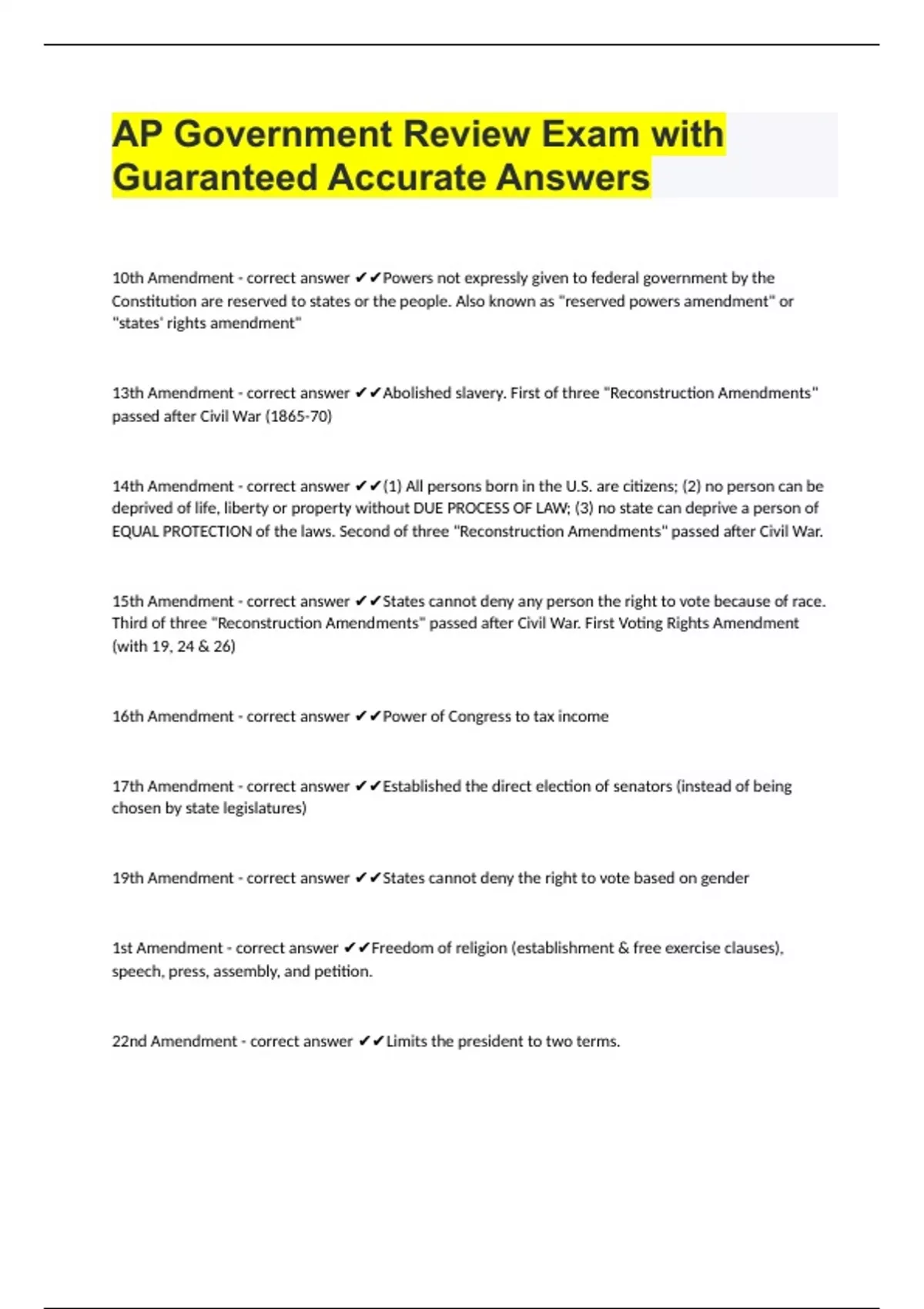 10th Amendment - correct answer Powers not expressly given to federal government by the Constitution are reserved to states or the people. Also known as "reserved powers amendment" or "states' rights amendment" 13th Amendment - correct answer Abolished slavery. First of three "Reconstruction Amendments" passed after Civil War (1865-70) 14th Amendment - correct answer (1) All persons born in the U.S. are citizens; (2) no person can be deprived of life, liberty or property without DUE PROCESS OF LAW; (3) no state can deprive a person of EQUAL PROTECTION of the laws. Second of three "Reconstruction Amendments" passed after Civil War. 15th Amendment - correct answer States cannot deny any person the right to vote because of race. Third of three "Reconstruction Amendments" passed after Civil War. First Voting Rights Amendment (with 19, 24 & 26) 16th Amendment - correct answer Power of Congress to tax income 17th Amendment - correct answer Established the direct election of senators (instead of being chosen by state legislatures) 19th Amendment - correct answer States cannot deny the right to vote based on gender 1st Amendment - correct answer Freedom of religion (establishment & free exercise clauses), speech, press, assembly, and petition. 22nd Amendment - correct answer Limits the president to two terms. 23rd Amendment - correct answer Gives Washington DC electoral college votes as if it were a state (DC still has no representation in Congress) 24th Amendment - correct answer Abolishes poll taxes 26th Amendment - correct answer States cannot deny the right to vote based on age (18+) 2nd Amendment - correct answer Right to arm bears. Supported by National Rifle Association interest group & Republican Party. 4th Amendment - correct answer No "unreasonable" searches and seizures. Exclusionary rule (Weeks v. US, Mapp v. Ohio) 5th Amendment - correct answer (1) No Self-Incrimination (Miranda) (2) No Double Jeopardy (defendant cannot be tried again on the same, or similar charges) (3) No deprivation of life liberty or property without "due process of law" (fair treatment) 6th Amendment - correct answer The right to counsel in criminal trials. Gideon v. Wainwright held that states must provide indigent defendants with a free lawyer ("public defender"). Right to jury in criminal trials.