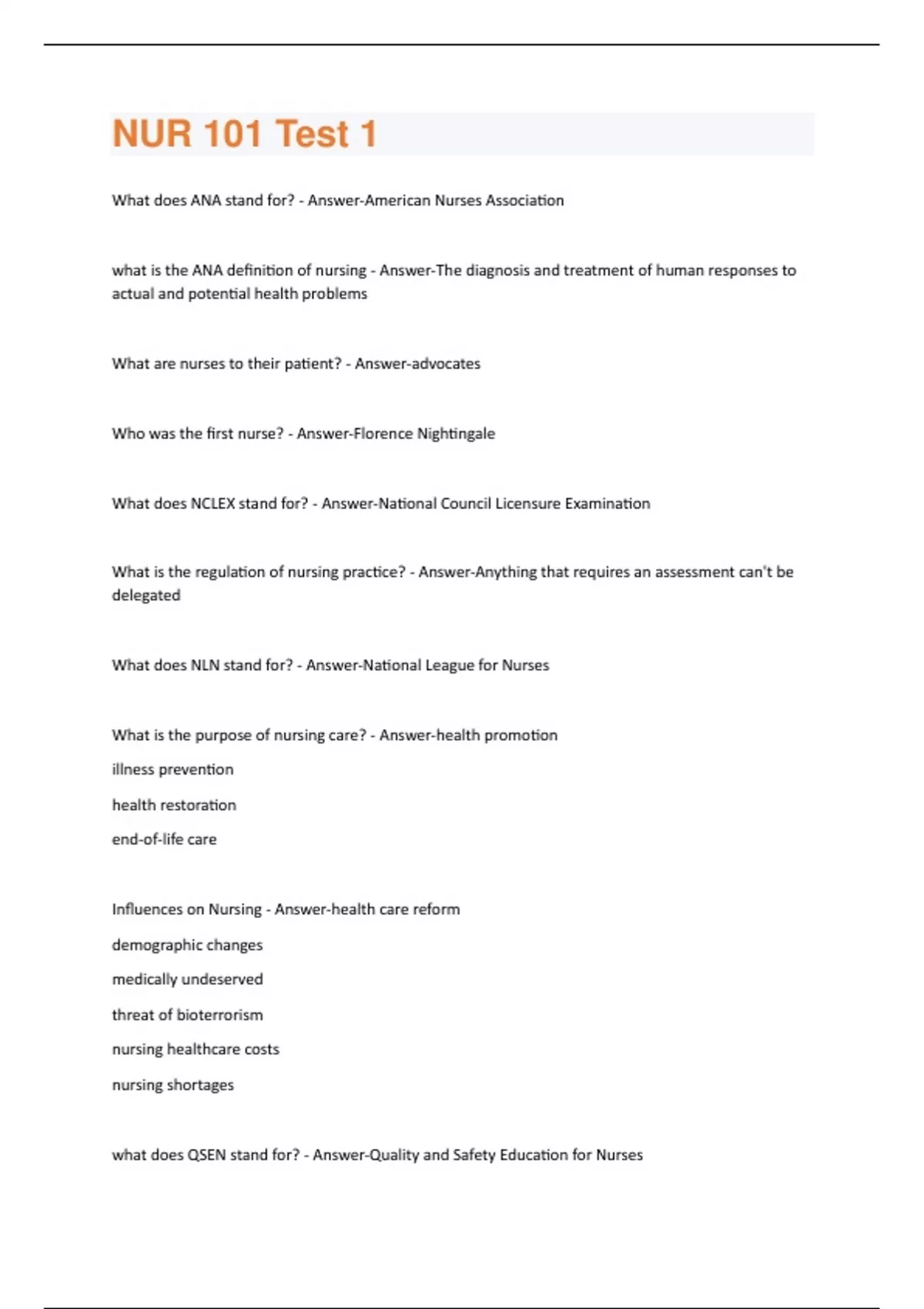 NUR 101 Test 1 Exam Questions And Answers Rated 100% Correct!!