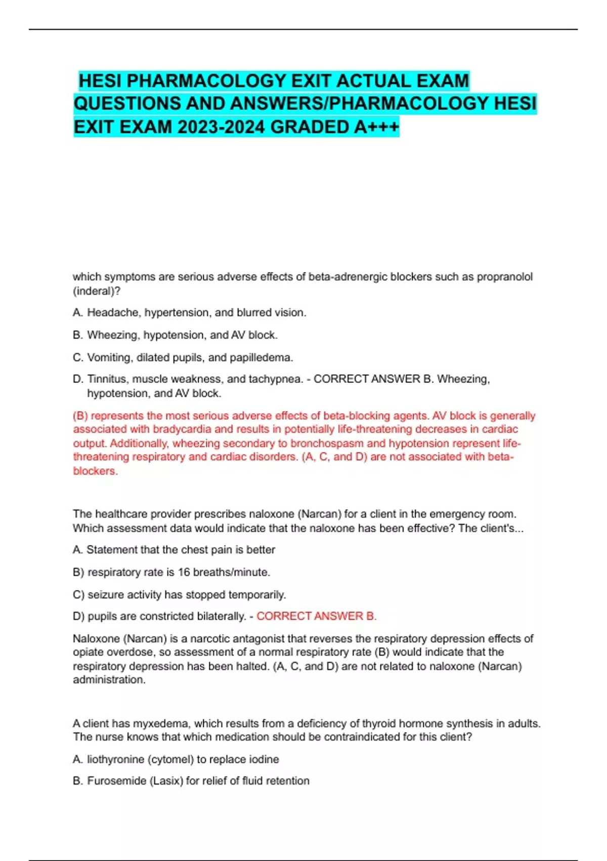 HESI PHARMACOLOGY EXIT ACTUAL EXAM QUESTIONS AND ANSWERS/PHARMACOLOGY HESI EXIT EXAM GRADED A+++