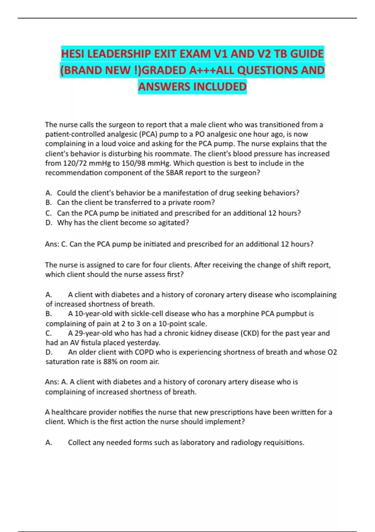 HESI LEADERSHIP EXIT EXAM V1 AND V2 TB GUIDE (BRAND NEW !)GRADED A+++ALL QUESTIONS AND ANSWERS INCLUDED